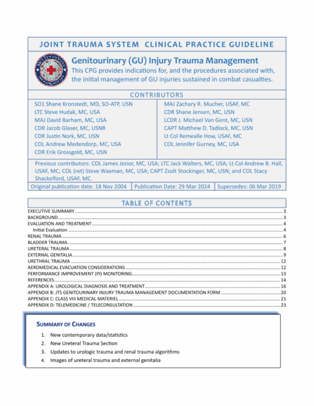 These guidelines provide direction for the identification of life-threatening GU injuries, control of hemorrhage, the establishment of urinary drainage, and the preservation of GU function when possible.
