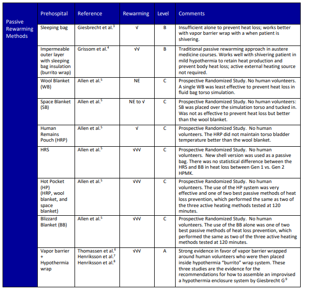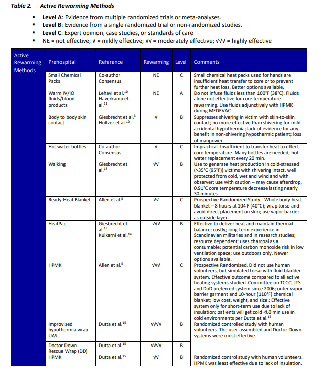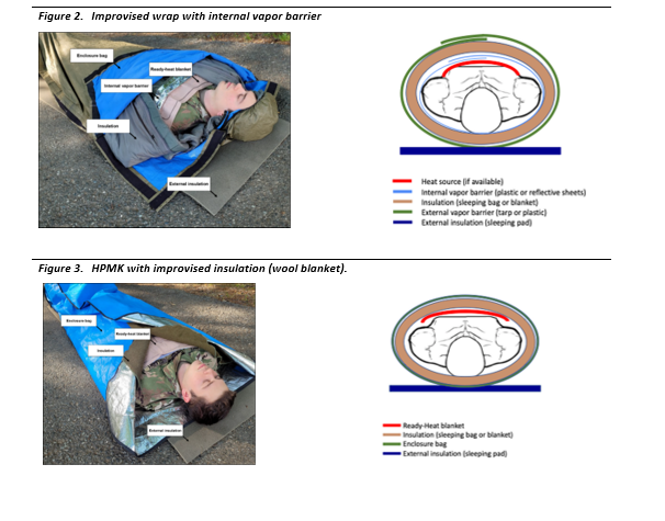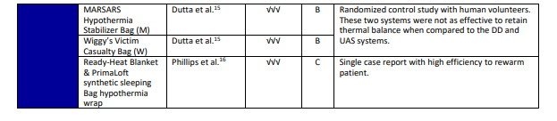 NOTE: Patient packaging with treatment for TIH is a core skill that should be deliberately planned and rehearsed prior to mission execution. A patient packaged for hypothermia prevention/treatment is difficult to access. Medical providers need to be cognizant of this fact and have a plan to monitor their patient’s status as well as their prior medical interventions.