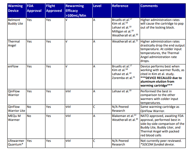 Innovation and improved outcomes-based research over the past two decades have improved survivability via addressing coagulopathy and acidosis .1,5,19–22 Early recognition and treatment of hypothermia is an equally important consideration that begins at the point of injury and should be implemented for all combat casualties, particularly patients at risk of experiencing shock. As it is labor and resource intensive to re-warm a casualty, measures to prevent hypothermia should begin as soon as possible with thermal wraps and warmed resuscitation products.5,23,24 There are varying degrees of abilities and resources availability at each echelon role of care, which are discussed in the following sections.