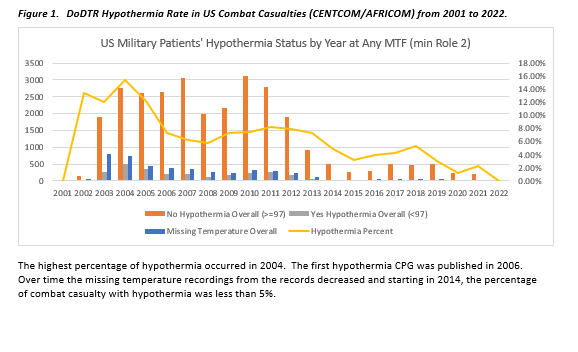 The Hypothermia CPG, initially published in 2006, was one of the first JTS CPGs. Prior to this, the rate of hypothermia (Temp <97 F) in patients arriving to the first role of care was as high as 15.42% in 2004. The rate initially dropped by over half to 7.26%. While it slowly increased again, it should be noted that missing temperature data in the DoD Trauma Registry (DoDTR) was as high as 42% when large volumes of casualties were being seen in 2003. The rate of missing data dropped significantly when the CPG was published yet remained in the 10-20% range. It is unclear if the true incidence was higher before 2006, but this potentially shows a Hawthorne effect and the effectiveness of tracking information to inform clinical practice. Figure 1 shows the trend in hypothermia by U.S. Military patients by year at any medical treatment facility (MTF). The purpose of this CPG is to provide guidance for the prevention and management of TIH in the combat casualty throughout the escalating roles of care.