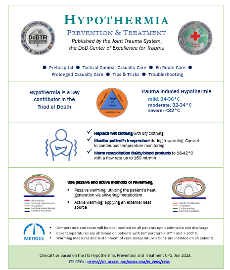 Hypothermia, coagulopathy, and acidosis are the physiological derangements constituting the “triad of death” in trauma patients.1–4 Here, we use the term trauma-induced hypothermia (TIH) as it relates more specifically to combat trauma including hemorrhagic shock, cerebrospinal injury, and burns - all of which lead to a significantly increased risk of mortality and presents as a separate, more severe entity than non-traumatic or environmental hypothermia. TIH is a ubiquitous concern regardless of the environment as it can occur even in warm climates, as has been the experience in the Middle East.5