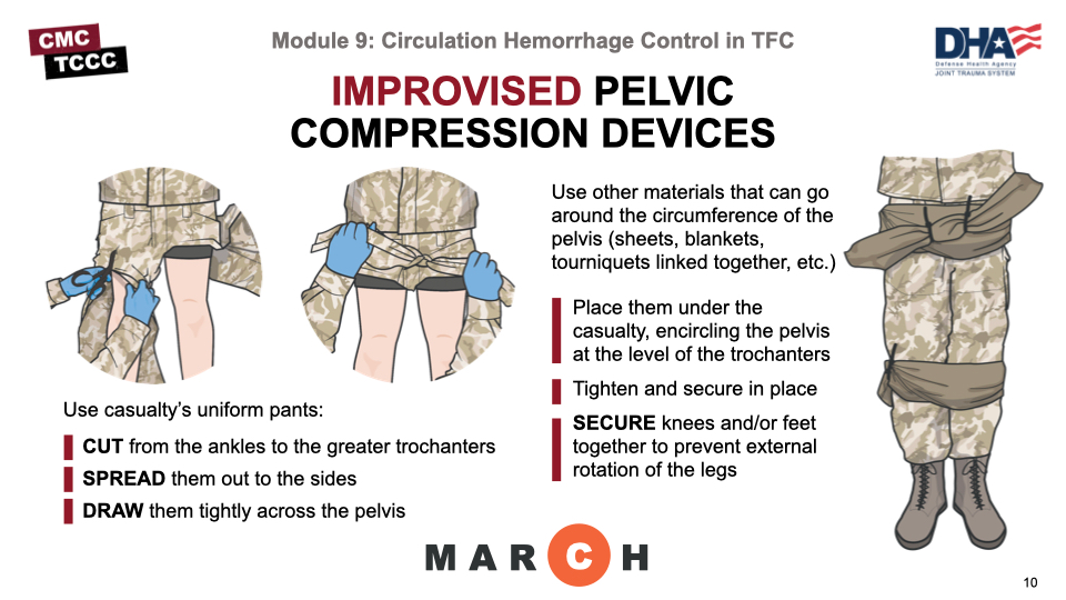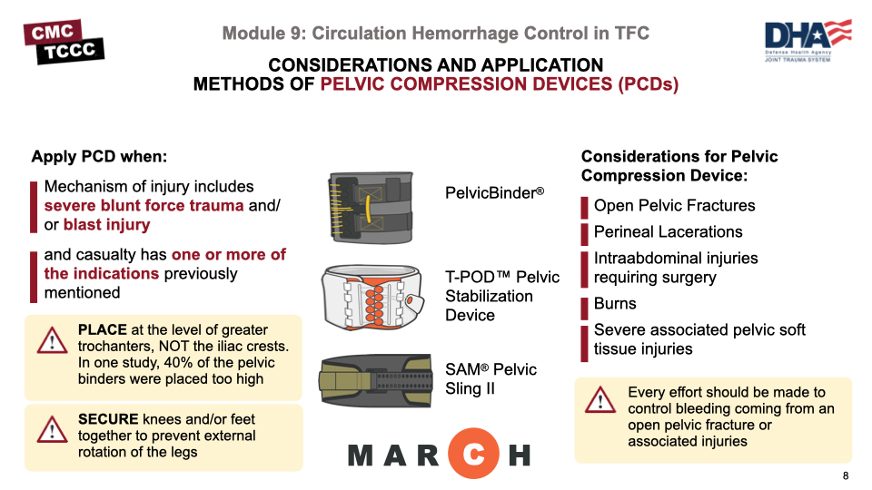 If the mechanism of injury raises the suspicion of a pelvic injury (IEDs, blasts, motor vehicle accidents (MVAs), etc.) and/or the five major signs and symptoms we just reviewed are present, then a PCD should be applied.
