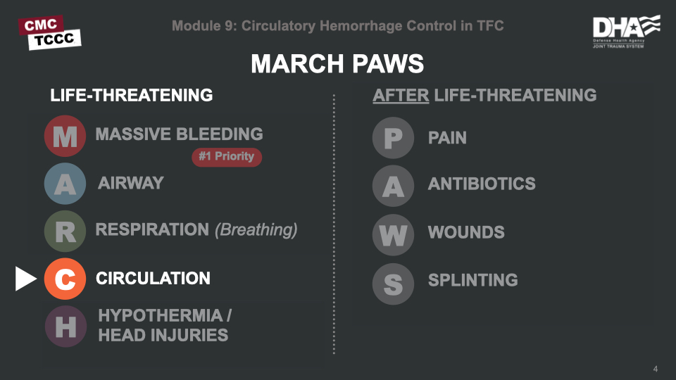 Circulation assessment and management is the “C” in the MARCH PAWS sequence.