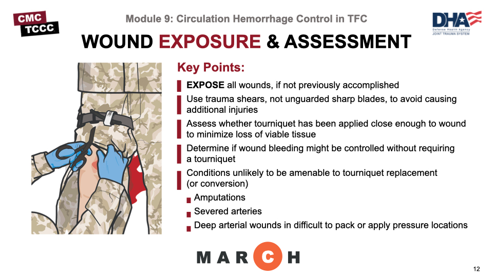 After reassessing bleeding control and applying a PCD, if appropriate, the next step is to expose any wounds, if that has not already been accomplished. Wound exposure should be accomplished using trauma shears rather than an unguarded blade to prevent further injury to the extremity. The objective of this is to determine if the bleeding from the wound might be controlled without a tourniquet and/or to assess whether a tourniquet might be applied closer to the wound to preserve as much viable tissue as possible.