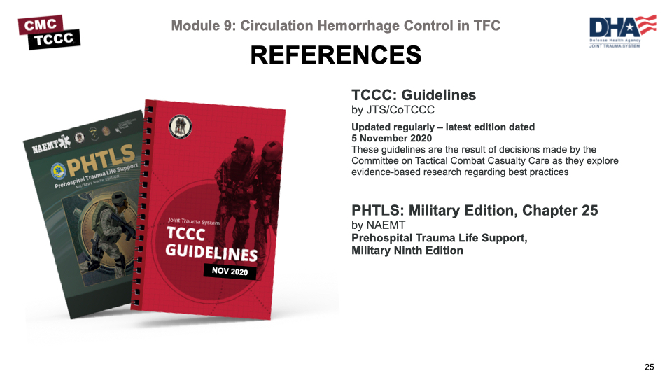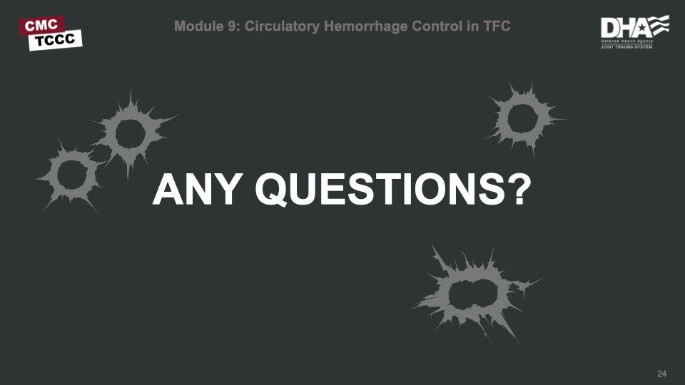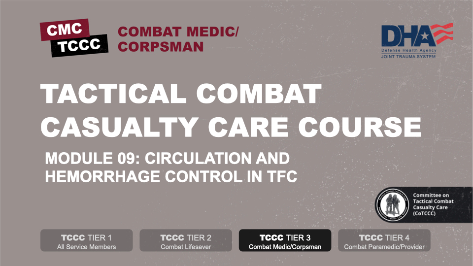 Over the next three modules, we will discuss circulation assessment and management in the Tactical Field Care (TFC) setting. This module will focus on hemorrhage control while the subsequent modules will address shock and fluid resuscitation. The didactic presentation will review several hemorrhage control principles, and skills stations will provide an opportunity to get hands-on practice for the procedures you will need to master.