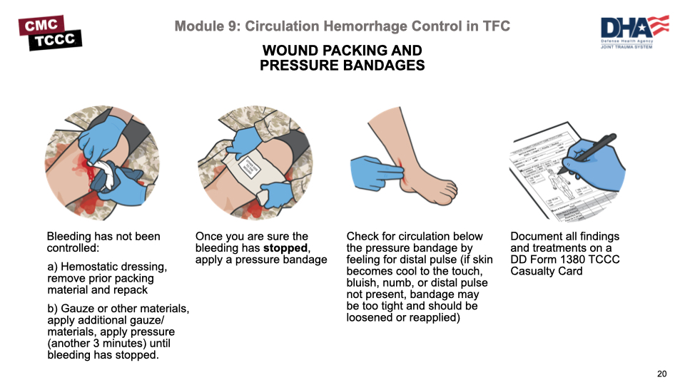 If the wound was packed, consider repacking the wound and reapplying the pressure bandage or moving to a tourniquet for definitive management. If a tourniquet has already been applied to a wound or previously packed and bandaged but is still bleeding, then tighten the original tourniquet, or if that fails to stop the bleeding and eliminate the distal pulse, consider applying a second tourniquet side-by-side, proximal to the original.