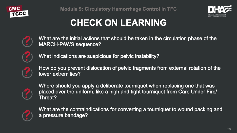 The first part of circulation management in TFC focuses on hemorrhage control. This includes identifying the progressive strategies for controlling external hemorrhage; identifying the signs and symptoms of a pelvic fracture; understanding the implications for placing a PCD; and identifying the indications and methods for wound packing and pressure bandages, tourniquet replacement, and tourniquet conversion.