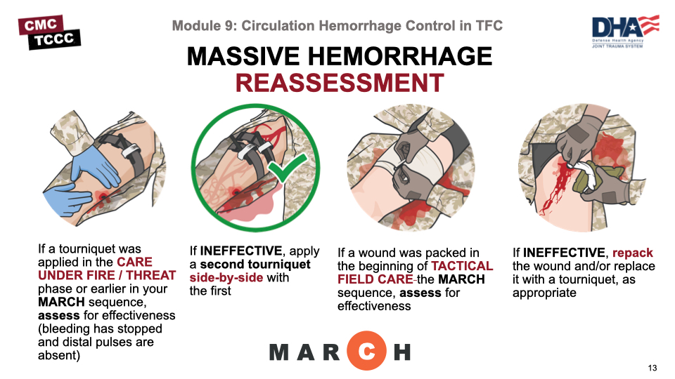 If a tourniquet was applied in the CARE UNDER FIRE phase or earlier in your MARCH sequence, assess for effectiveness. If ineffective, replace any limb tourniquet placed over the uniform with one applied directly to the skin 2-3 inches above the bleeding site. Ensure that bleeding is stopped. If a deliberate tourniquet that was placed in TFC is ineffective, apply a second tourniquet side-by-side with the first.