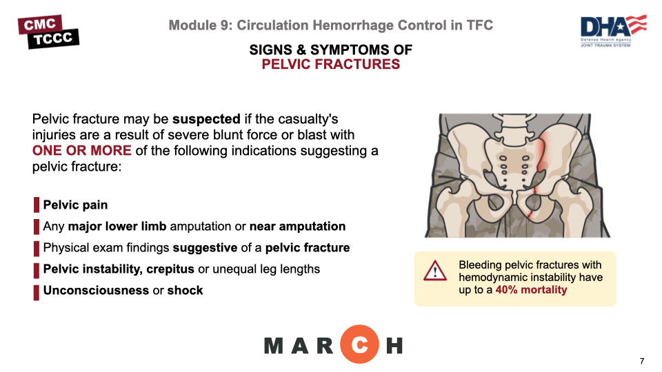 If the casualty is not experiencing persistent massive external hemorrhage, the potential for massive internal hemorrhage from a pelvic injury should be assessed. Most pelvic fractures are associated with dismounted improvised explosive device (IED) attacks accompanied by amputations, but they also occur in severe blunt trauma (such as motor vehicle crashes, aircraft mishaps, hard parachute landings, and falls). 26% of service members who died in OEF/OIF had a pelvic fracture, and bleeding pelvic fractures with hemodynamic instability have up to a 40% mortality.