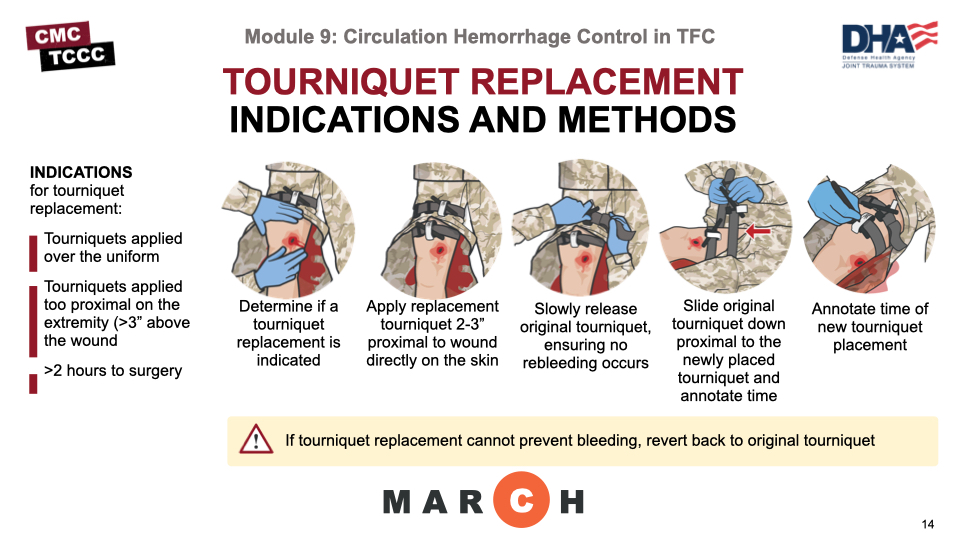 The tactical considerations during Care Under Fire or the uncertainty of the extent of bleeding during the massive hemorrhage phase in Tactical Field Care will sometimes lead to a bleeding control decision that can be managed differently once the situation is more controlled and more information can be gathered from the exposed wound. We’ll spend the next couple of minutes talking about the indications and processes for replacing tourniquets and for converting tourniquets.