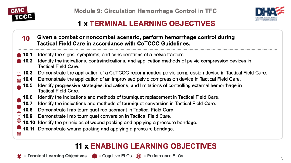 The performance learning objectives are applying both a Committee on Tactical Combat Casualty Care (CoTCCC)-recommended and an improvised PCD, wound packing and pressure bandage application, tourniquet replacement, and tourniquet conversion.