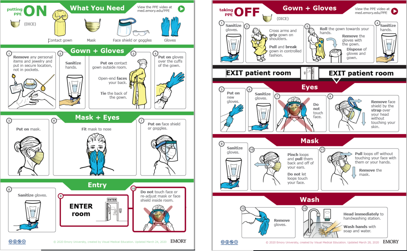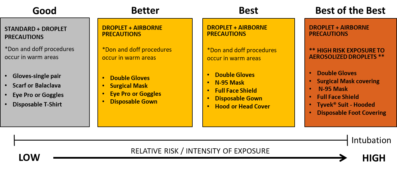Better: Surgical mask or N95 mask, face shield (either standalone or with mask) and eye protection, gloves, gown (surgical or contact), head covering.