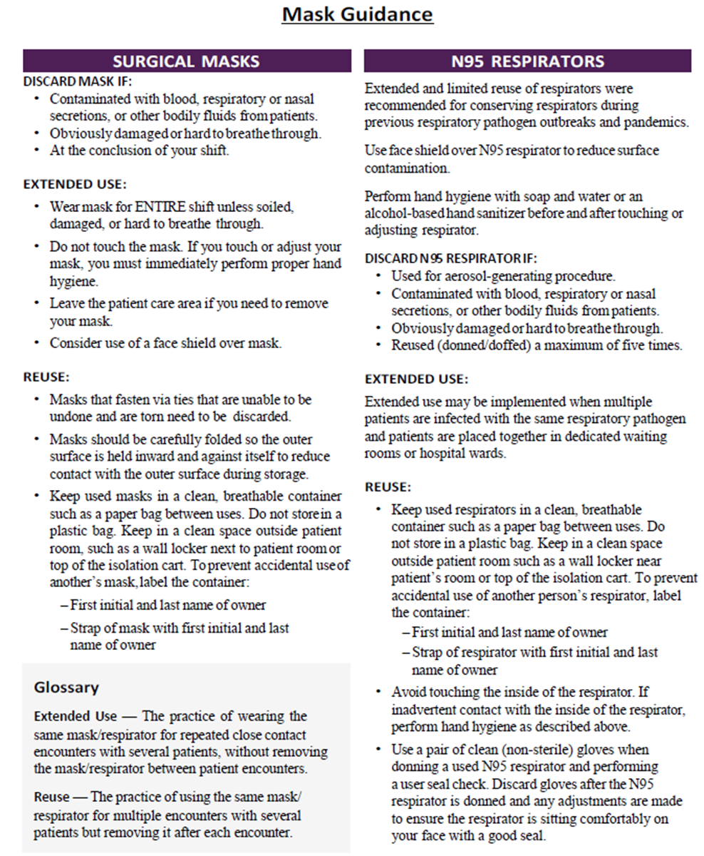 U.S. National Institute for Occupational Safety and Health recommends the following for extended use and re-use of N95 respirators: