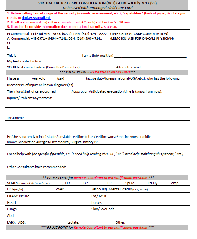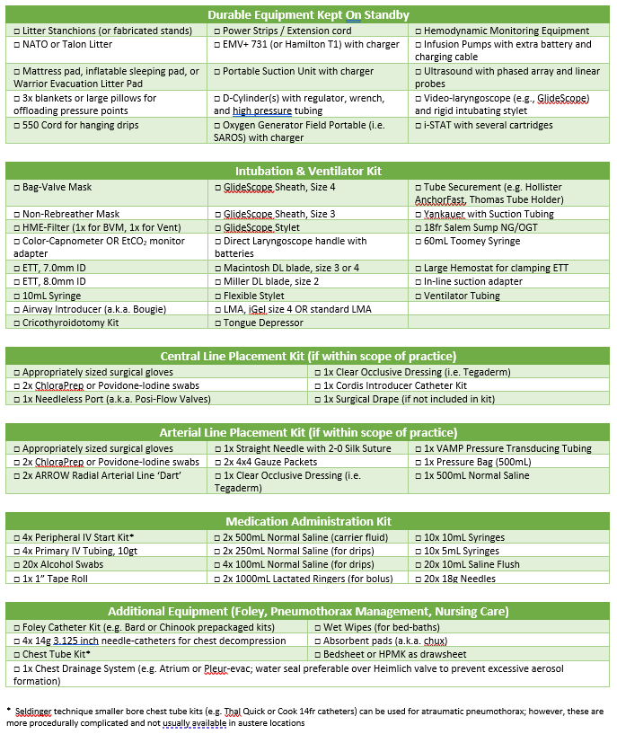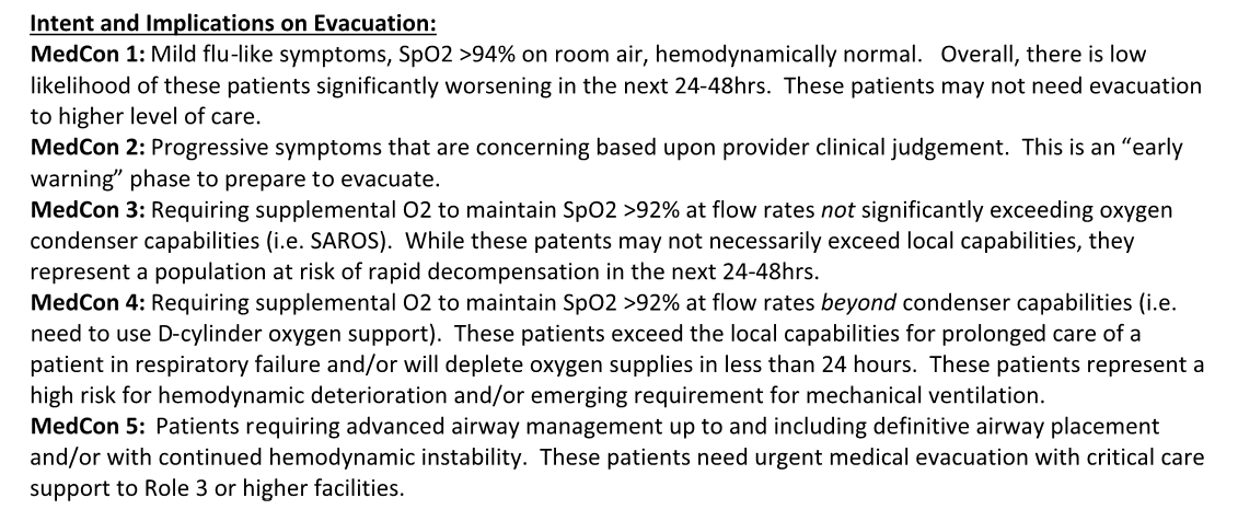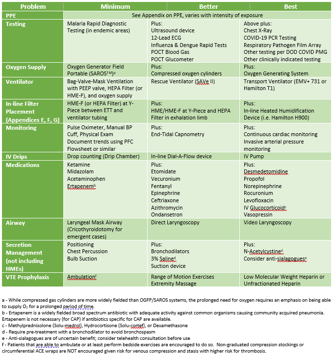 This guideline is intended for the provider operating in an austere, limited resource setting. Providers have varying levels of knowledge, training, and experience in basic critical care concepts. It is not intended to be all inclusive, but to spur further thinking and identify areas where resource limitations or known diseases specify changes to usual practices. The management strategy described is designed for a 24-hour hold of a single critically ill patient and is tailored to the equipment and medications typically available in austere operational settings (Role 1 and Expeditionary Role 2). Refer to the most updated DoD COVID-19 Practice Management Guide for recommended clinical management, and CENTCOM COVID-19 Playbook for operational considerations.
