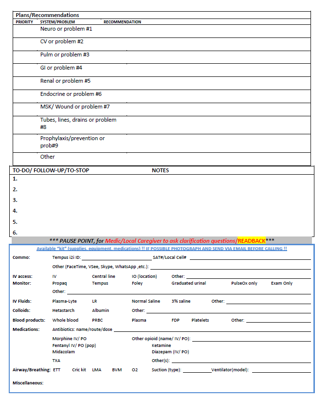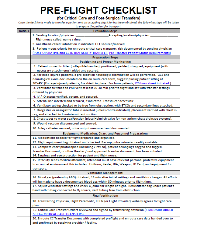 Leads: MAJ William E. Harner, MC, USA; LTC Sean C. Reilly, MC, USA Special thanks to Respiratory Therapists at Landstuhl Regional Medical Center. Special thanks to Flight Paramedics and ECC Nurses at Fort Rucker, Alabama. Special thanks to the TCMC training faculty at Fort Sam Houston, Texas