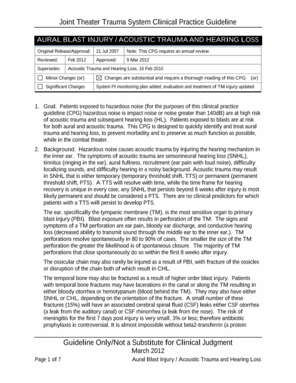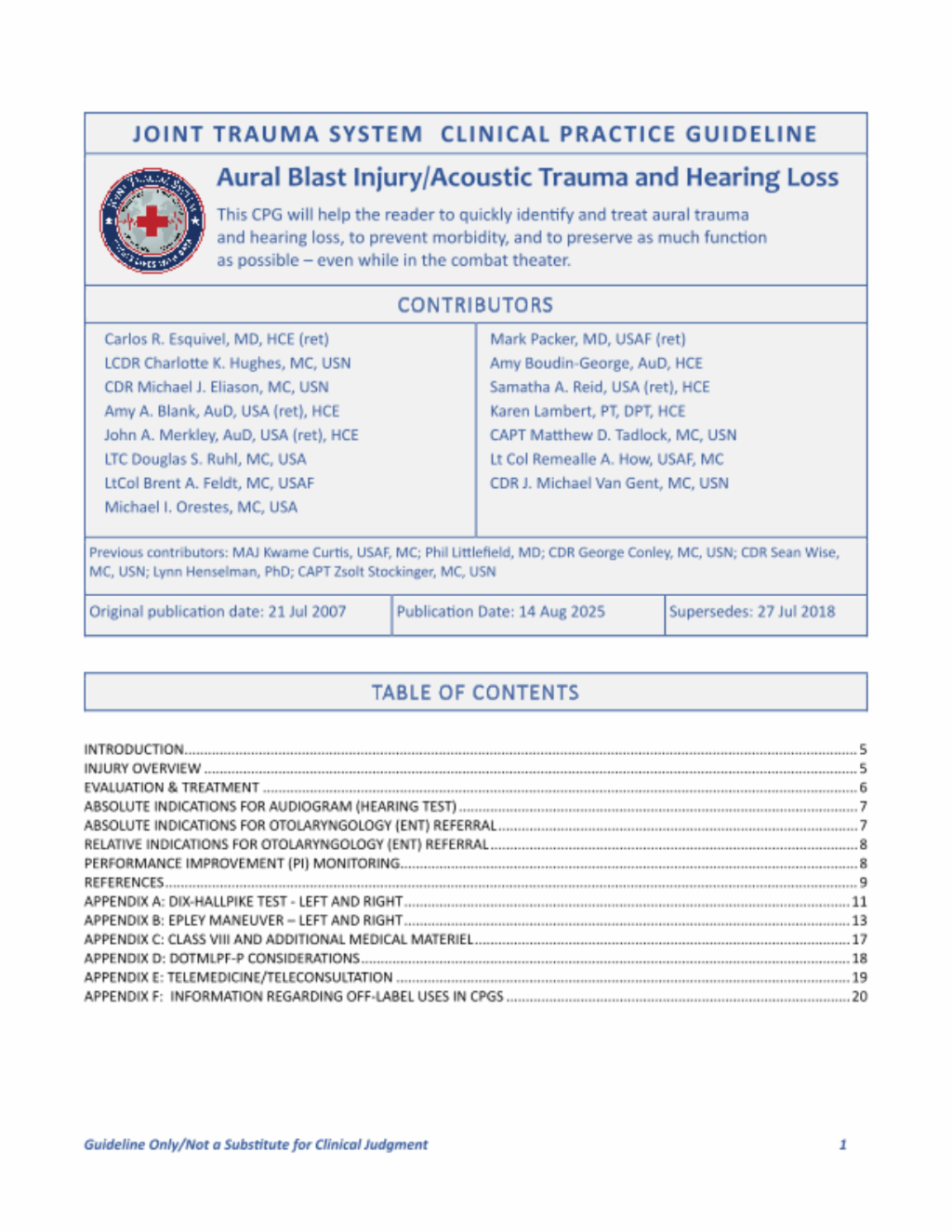 The goal of this CPG is to elevate awareness of noise threats, the prevalence of hazardous noise exposure, and the symptoms of acoustic trauma for the purpose of facilitating early identification and intervention of acoustic trauma. Improving outcomes for hearing requires developing trusted and functional prevention practices and technologies, as well as a surveillance and early referral and reporting system. This facilitates timely evaluation and diagnosis within therapeutic windows when intervention may mitigate injury progression. Improving the outcomes from acoustic trauma will preserve hearing capabilities in ranges conducive to continued high-level function and performance.