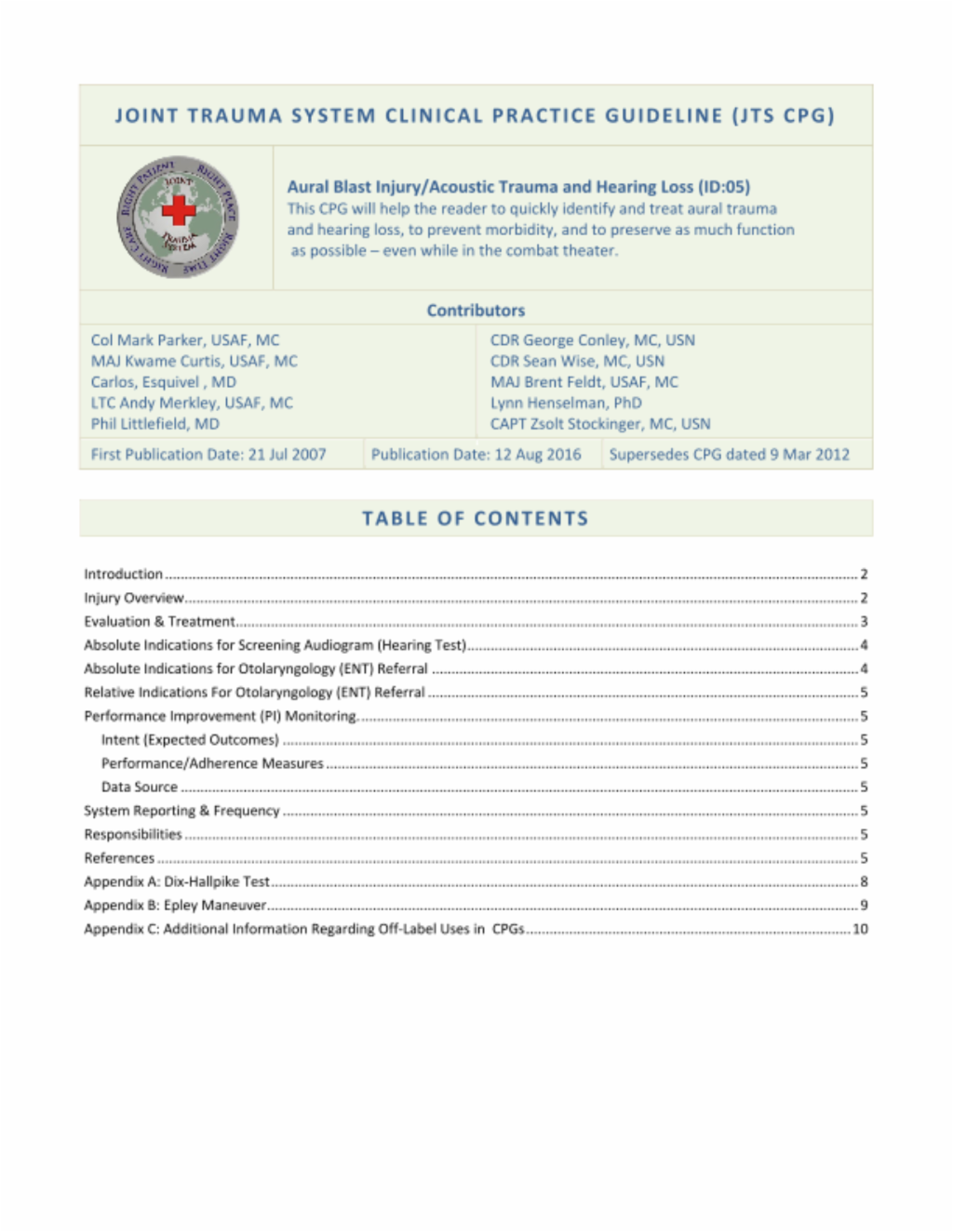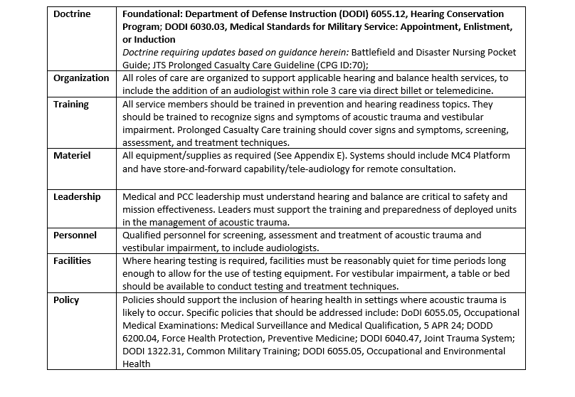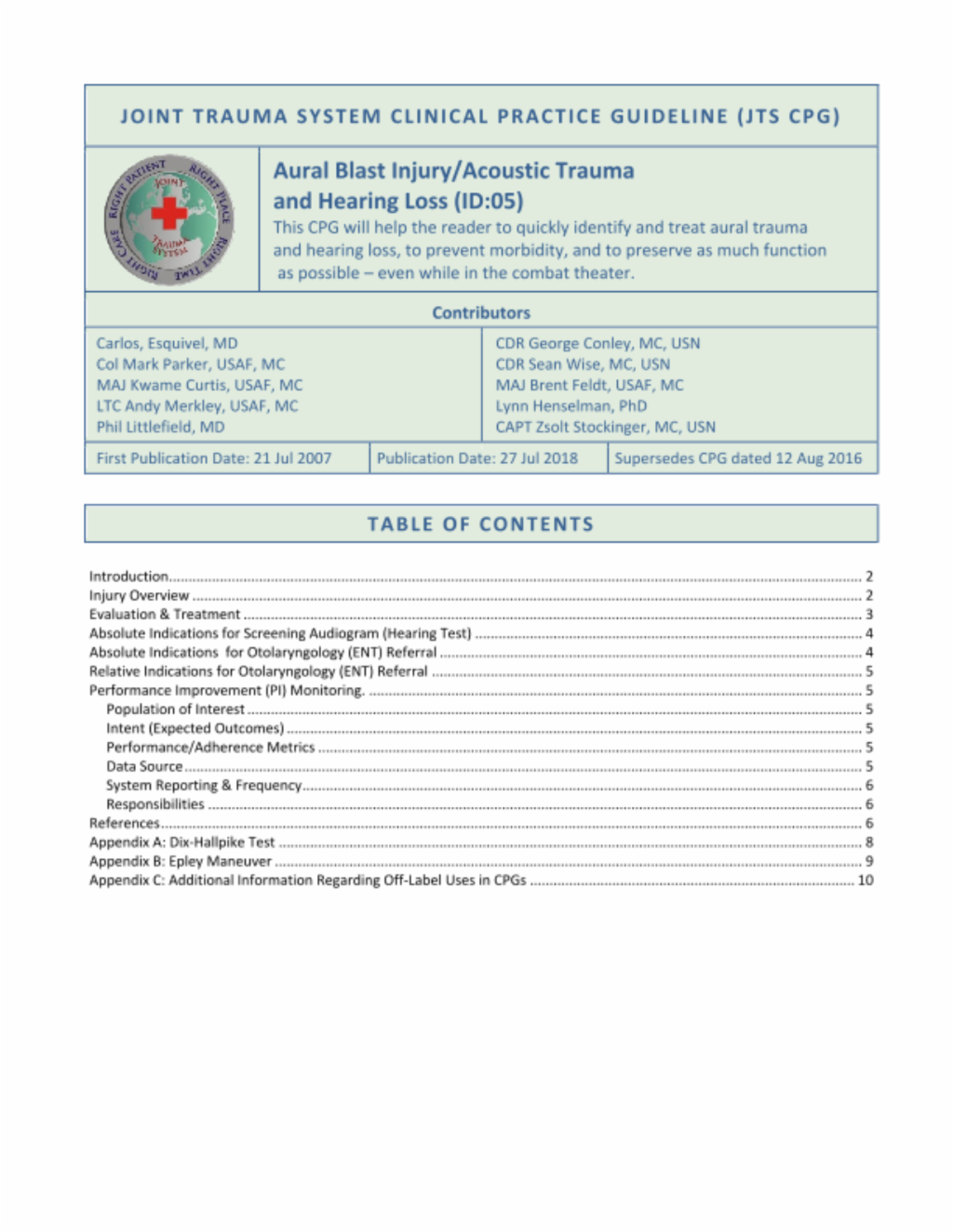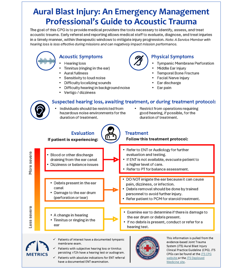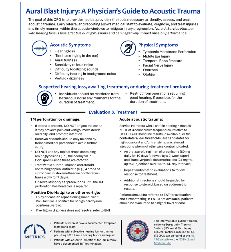 Timely management of acoustic trauma requires recognition of the symptoms by the injured service member and training for everyone in the medical chain on appropriate assessment, referral, and treatment methods. Training on the symptoms and management may be conducted as part of a formal course for Prolonged Casualty Care. Further, information from this CPG may be incorporated into relevant field manuals and pocket guides. Without training, the symptoms may go unreported and untreated, leading to longer term hearing loss and downstream effects on operational performance.