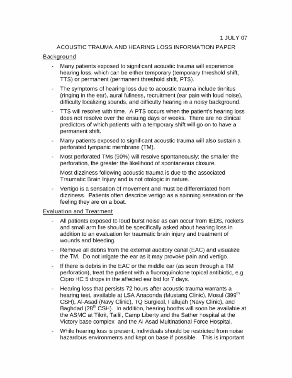 Hearing loss that persists 72 hours after acoustic trauma warrants a hearing test or audiogram. If available, test hearing as soon as possible after acoustic injury to document TTS (before 72 hours). When hearing loss is present, individuals should be restricted from continuous noise great then 85dB or weapon firing period. This is important to allow time for healing since the inner ear is more susceptible to additional noise-induced damage while it is under the oxidative stress and glutamate toxicity of an acute injury. A Service Member with hearing loss is less effective during missions and can negatively impact mission performance.25