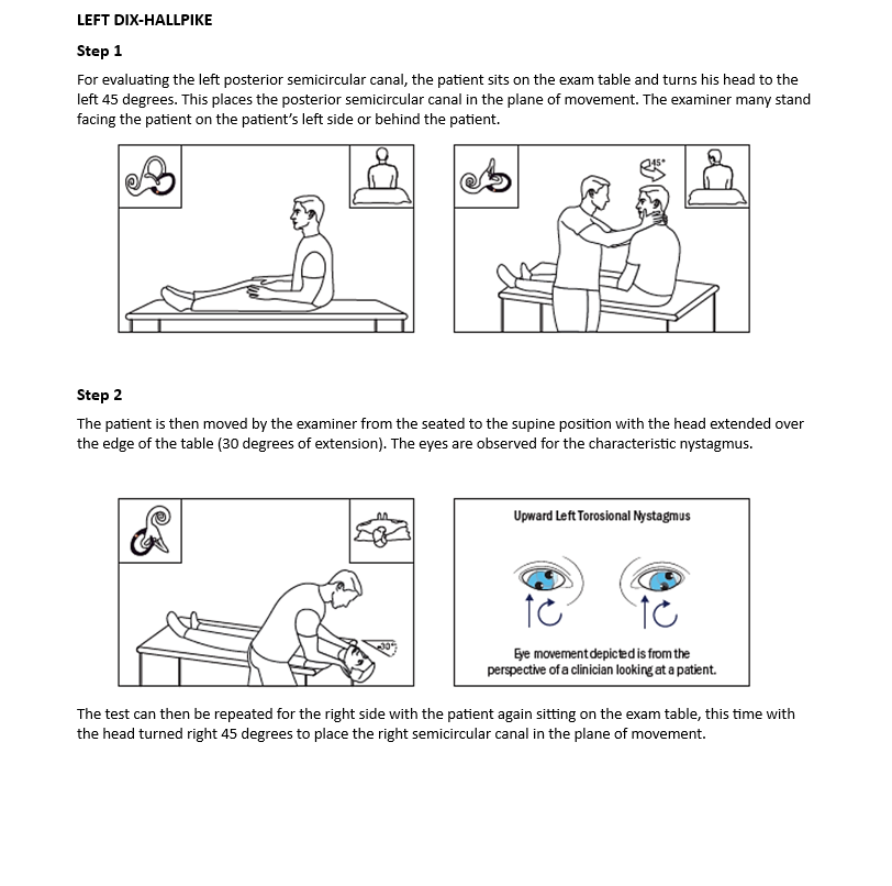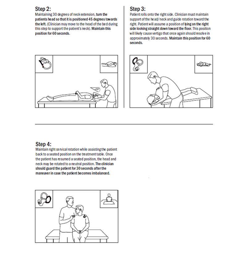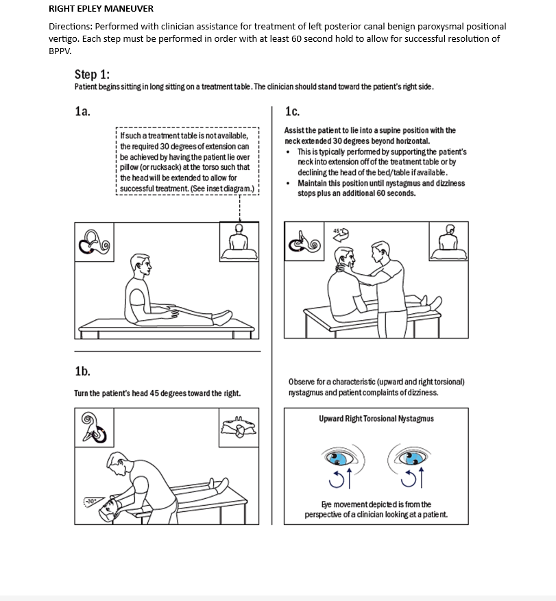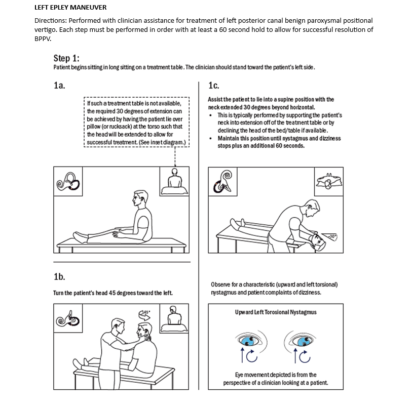 Vestibular trauma may manifest dizziness, unsteadiness, or vertigo. Please refer to the Veteran Affairs/DoD vestibular clinical recommendations for a detailed review of traumatic dizziness patients with positional vertigo and without other contraindicating injuries should undergo Dix-Hallpike testing. An Epley maneuver or canalith repositioning should be performed if Dix-Hallpike testing was positive. (See Appendix A and Appendix B.) There is evidence between BPPV recurrence and low serum vitamin D levels. In patients with BPPV, we recommend vitamin D serum testing and supplementation in patients when levels are deficient.26,27