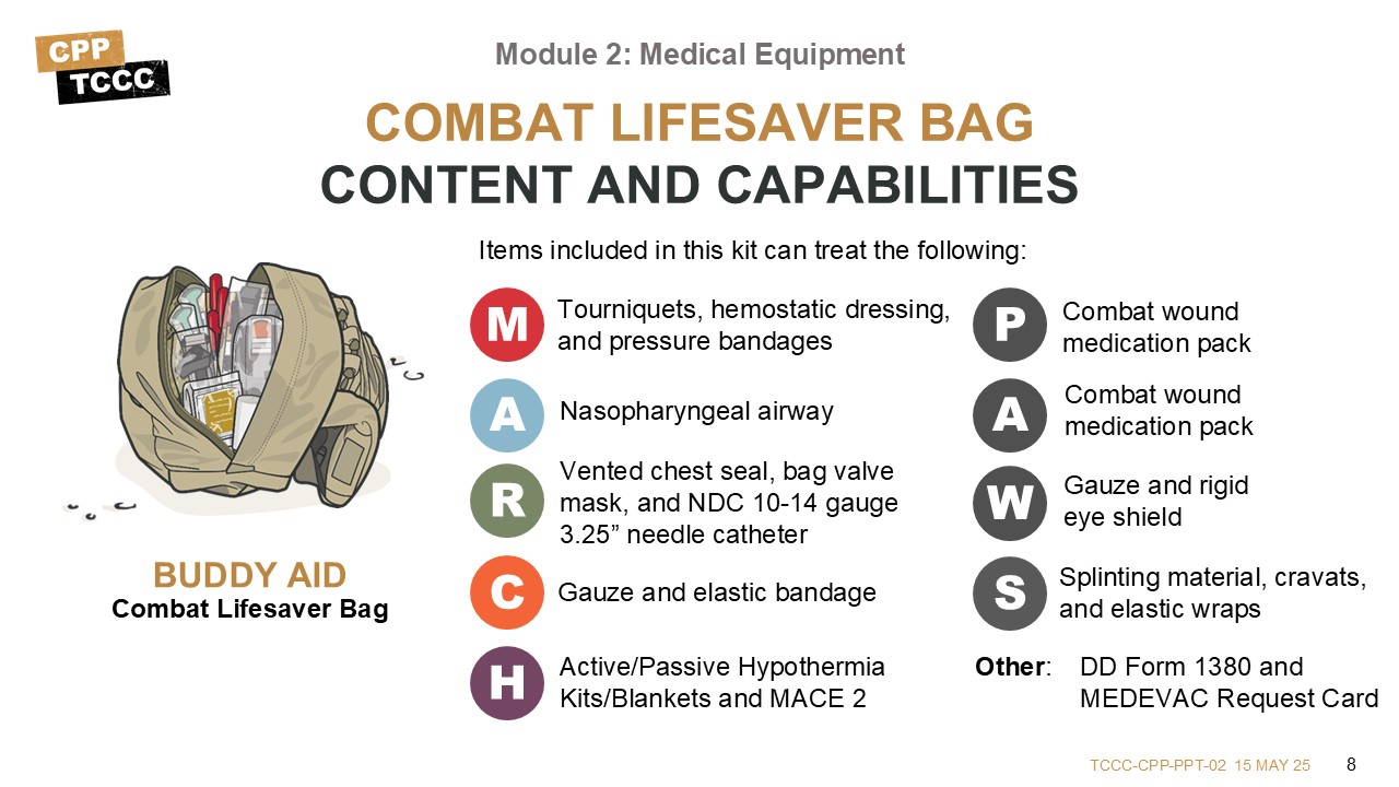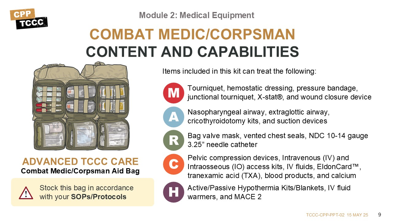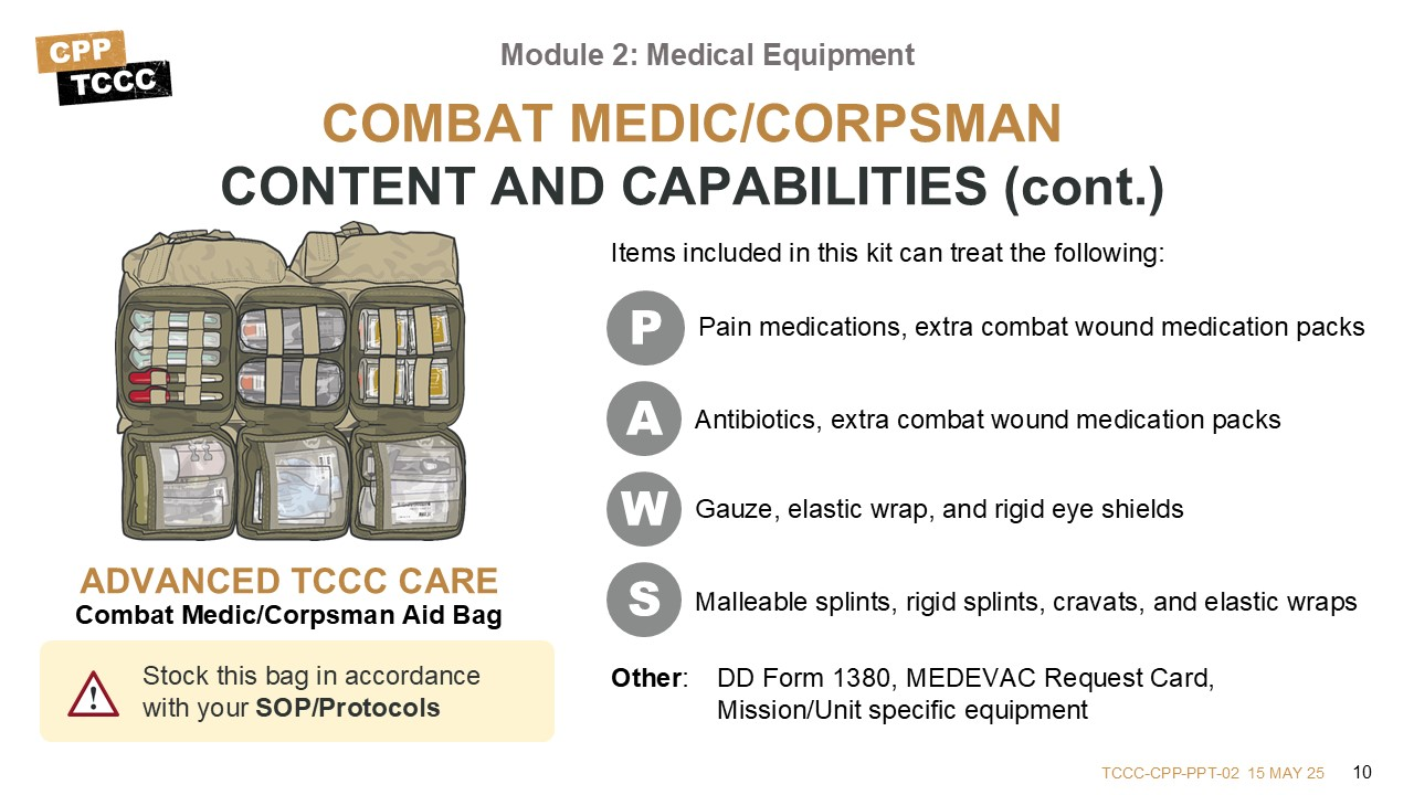 This lesson provides an opportunity to get a hands-on introduction to the kits and their contents. The equipment discussed supports the provision of TCCC per the current guidelines and enables the All Service Members, Combat Lifesaver, Combat Medic/Corpsman, or Combat Paramedic/Provider to address issues identified in Care Under Fire, Tactical Field Care, and TACEVAC Care using the MARCH PAWS approach.