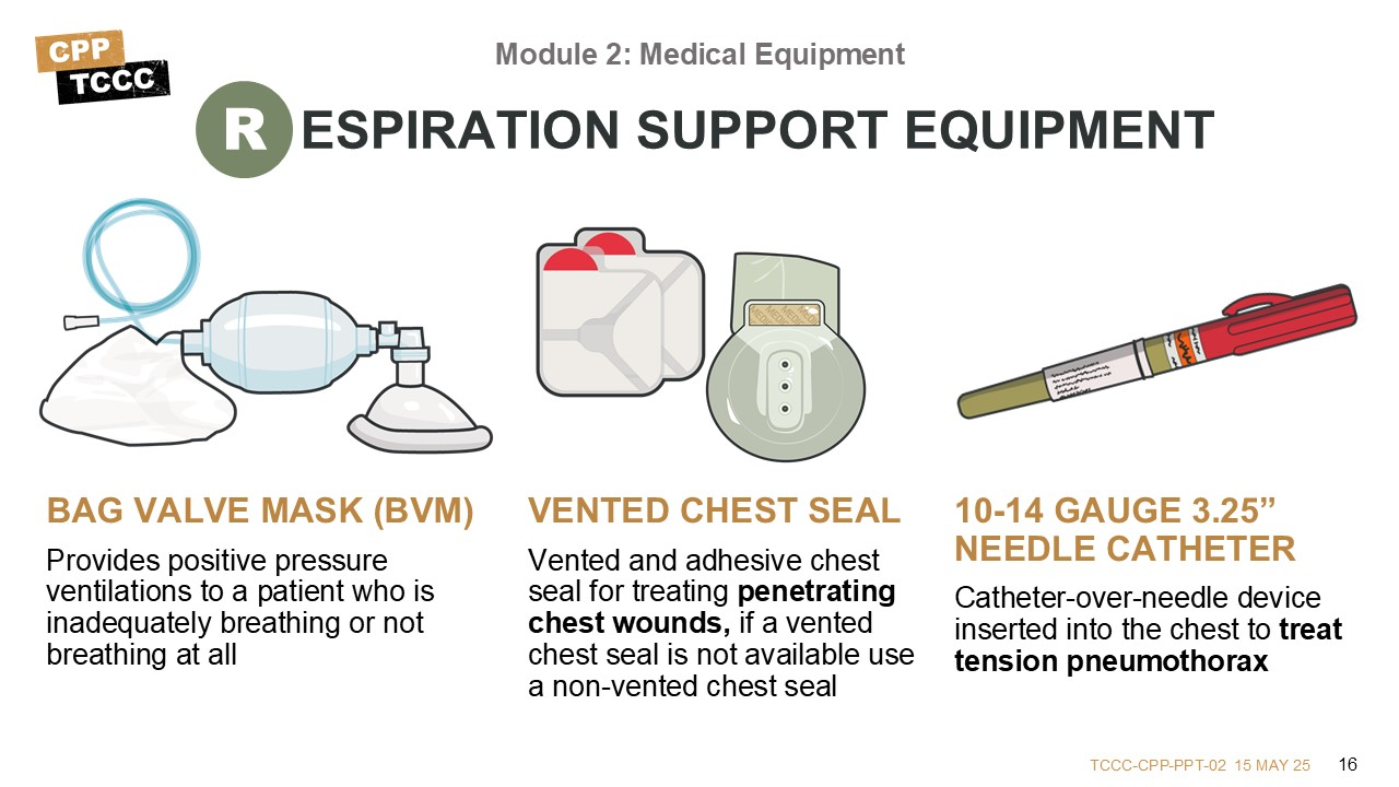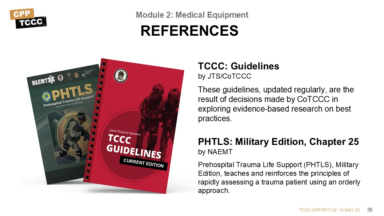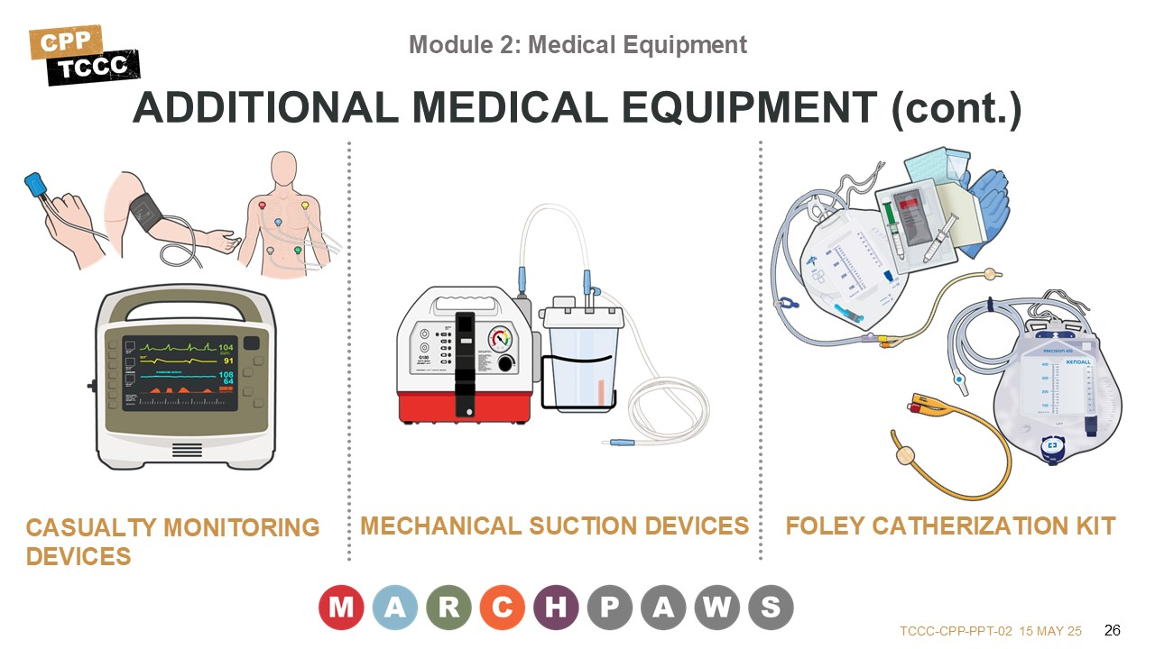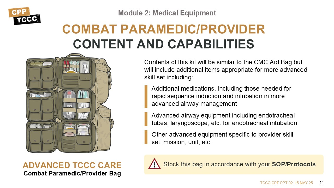 This lesson provides an opportunity to get a hands-on introduction to the kits and their contents. The equipment discussed supports the provision of TCCC per the current guidelines and enables the All Service Members, Combat Lifesaver, Combat Medic/Corpsman, or Combat Paramedic/Provider to address issues identified in Care Under Fire, Tactical Field Care, and TACEVAC Care using the MARCH PAWS approach.