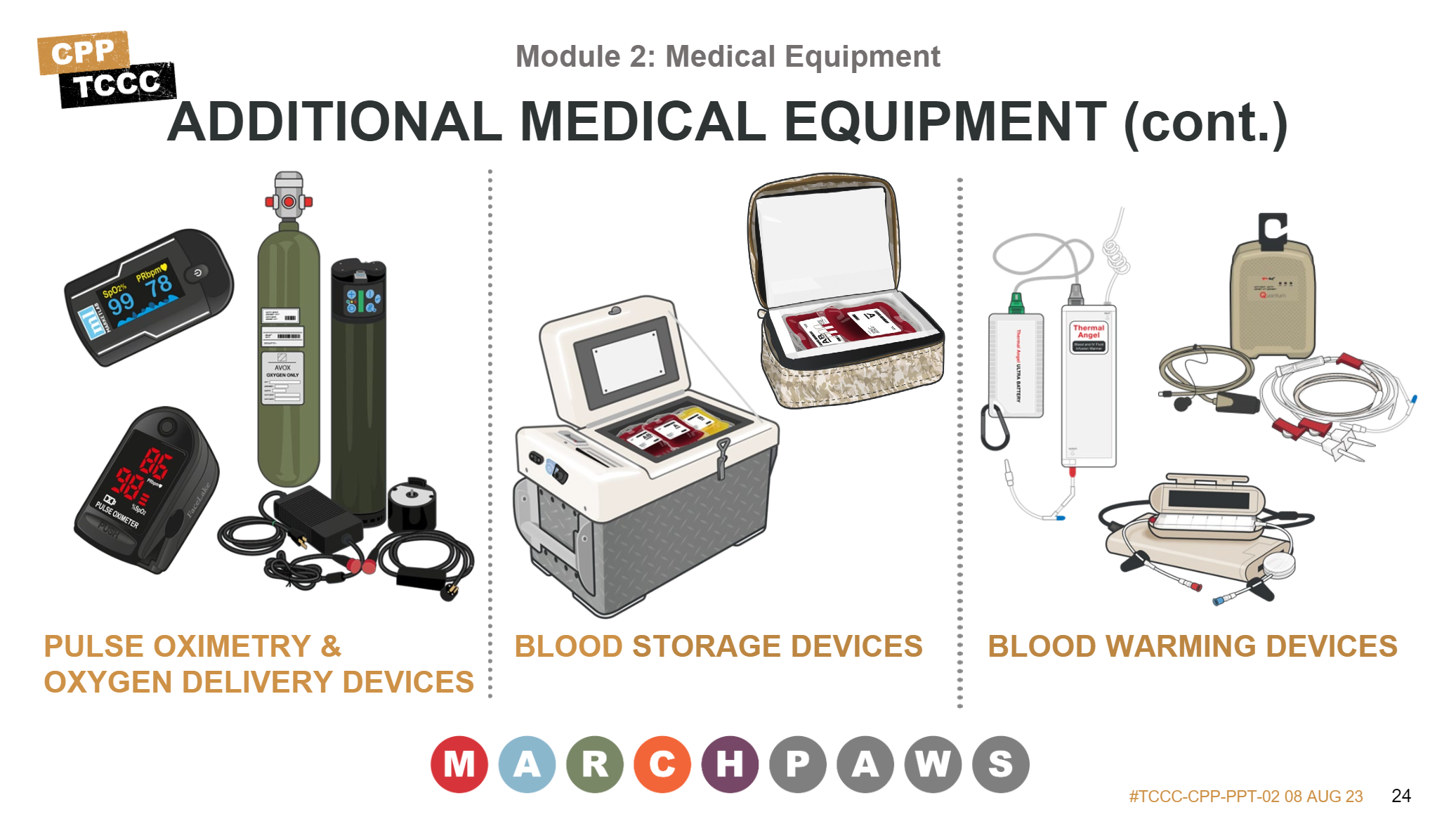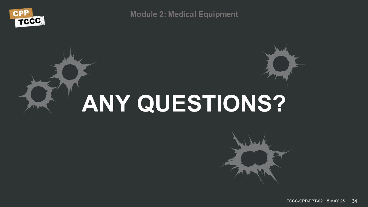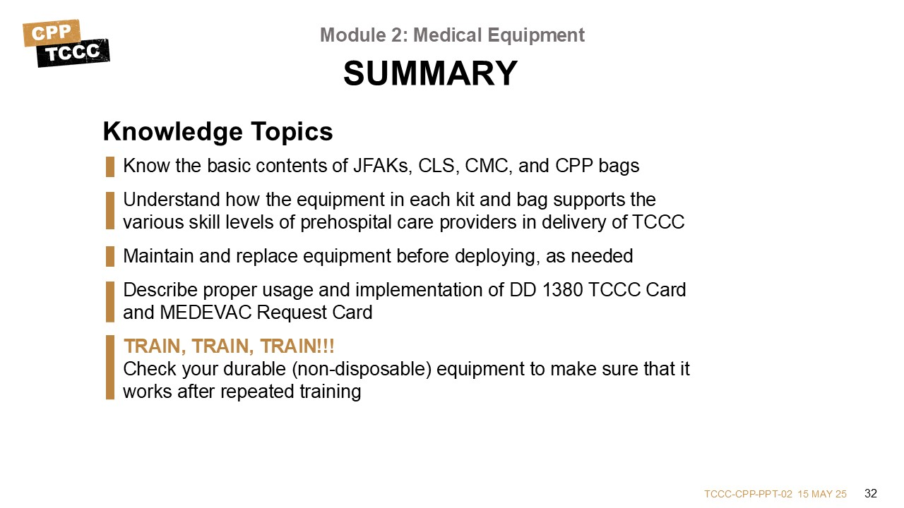 You should now be able to identify the basic equipment usually found in individual kits, or JFAKs, Combat Lifesaver kits, Combat Medic/Corpsman aid bags, and CPP kits, understanding that the needs of the CPP can vary from person to person. Likewise, you should be able to describe how the various kits support TCCC delivery following the MARCH PAWS treatment approach.