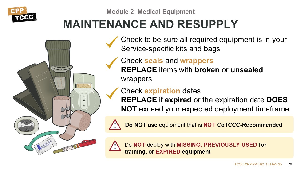 Make sure all required and applicable equipment is in your Service-specific JFAKs, CLS bags, CMC aid bags, and CPP kits.