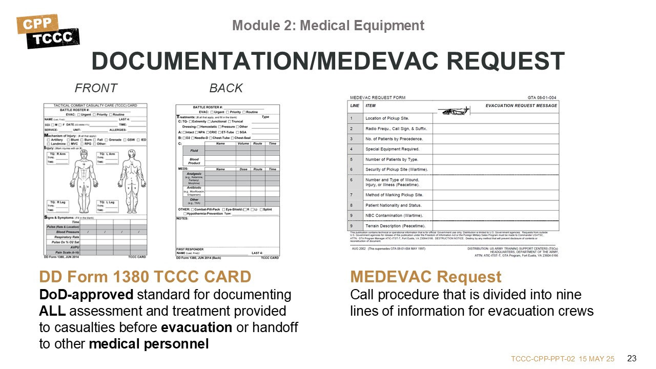 Proper documentation is the responsibility of all who render care, including Combat Lifesavers, Combat Medics and Corpsmen, and Combat Paramedics and Providers. The DD Form 1380 TCCC card is the DoD-approved form for official casualty care documentation of all findings and treatment (as outlined by the TCCC Guidelines) and must be completed on every casualty before handoff to another provider and/or evacuation to a medical treatment facility. It should be in each Service member’s JFAK, preferably with the demographic information filled out in advance, but extra copies should be found in CLS, CMC, and CPP kits, too.