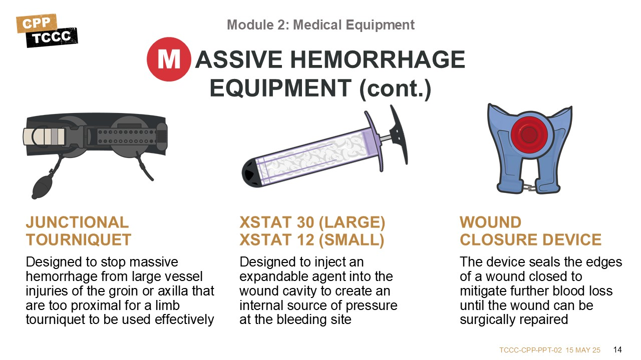 With massive hemorrhage accounting for the largest number of preventable deaths on the battlefield, the equipment to support bleeding control is found in almost all kits. Key items are highlighted here.