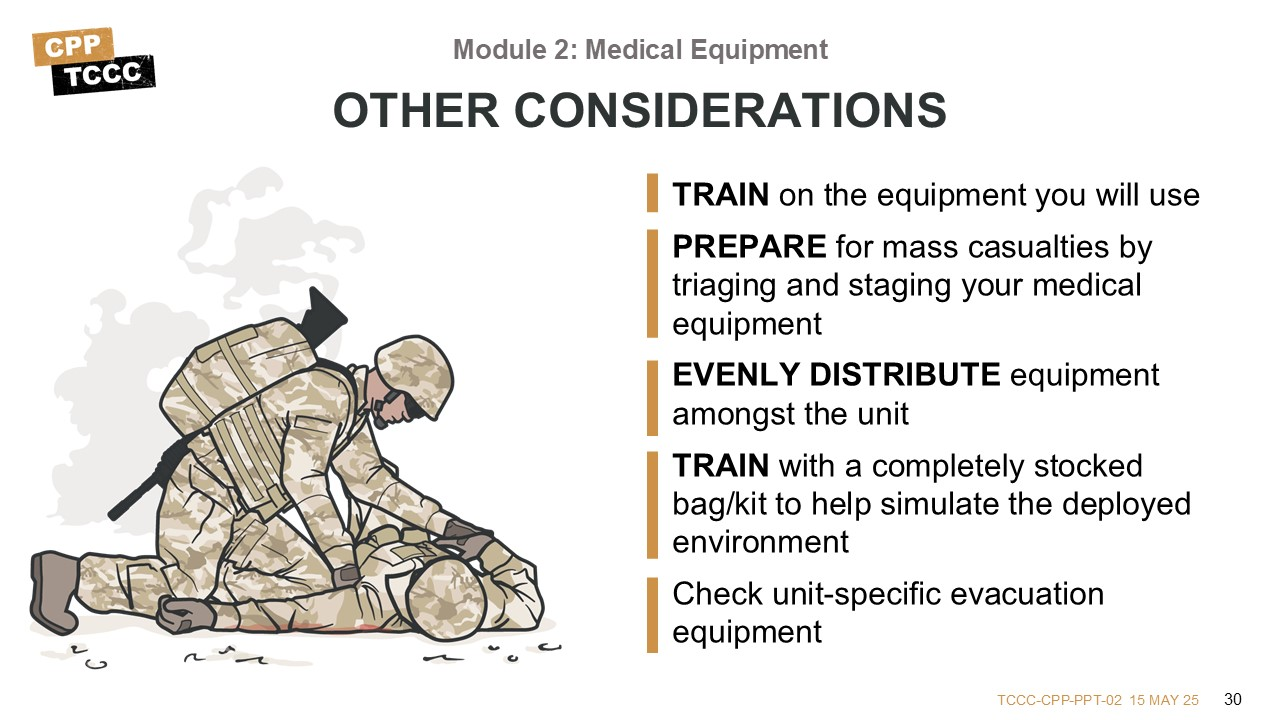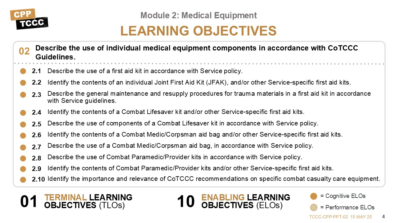 During this module, we will discuss the medical equipment used during Tactical Combat Casualty Care, including the importance and relevance of CoTCCC recommendations on the use of specific combat casualty care equipment. There are ten learning objectives starting with understanding how first aid kits are used in accordance with Service policy.