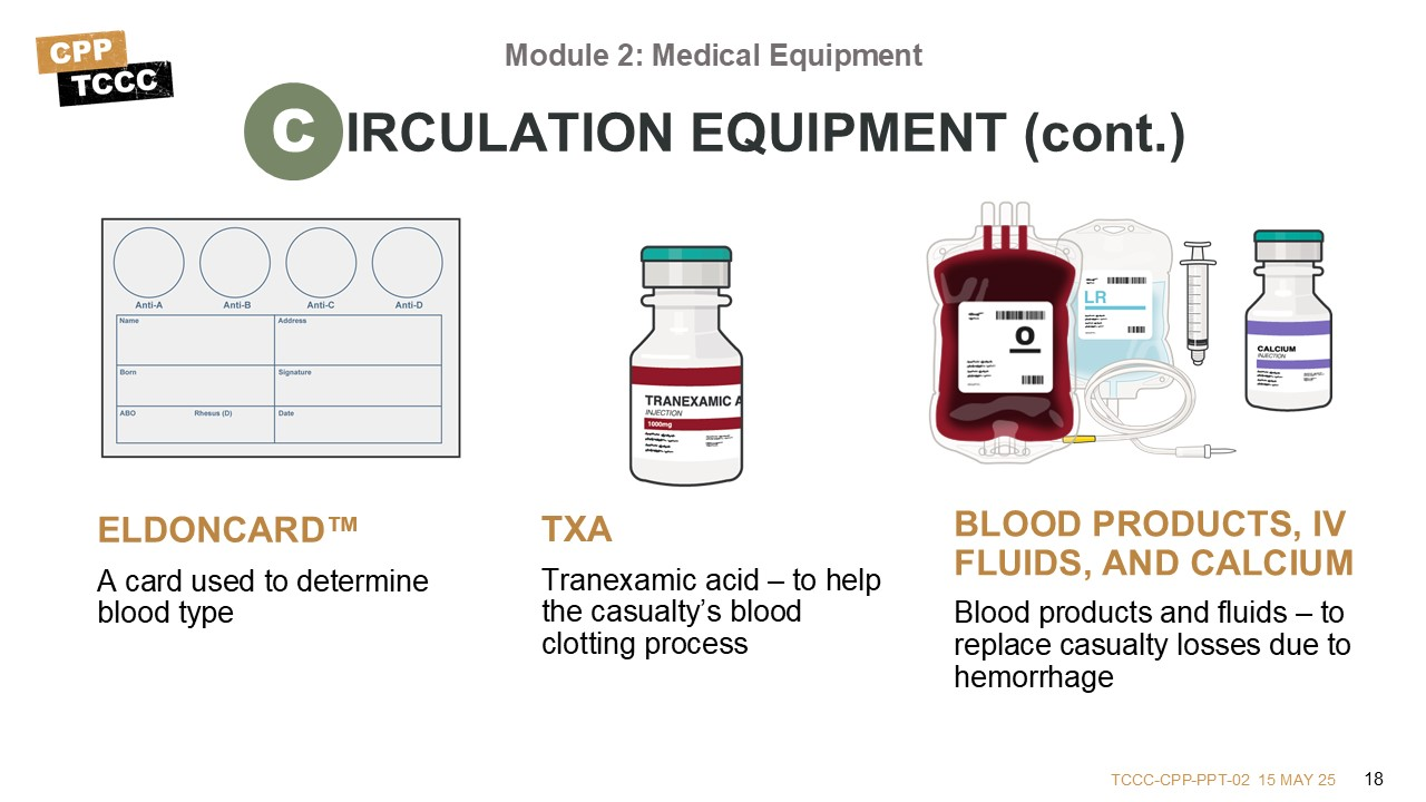 Most of the equipment to support circulation and shock issues is found in the CMC and CPP kits, as opposed to the other kit levels. Replacing lost blood from hemorrhage requires access to administer resuscitation fluids/blood products. One common approach is intravenously, which requires several supplies – catheters, the equipment to start an IV, and a saline lock or IV tubing. Also, intraosseous access can provide a quick and reliable source of access to give medications, blood, or resuscitation fluids, and can be established at sternal, humeral, or tibial sites.