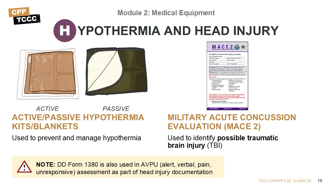 Although there are no materials that specifically address head injury treatment, the AVPU assessment can be documented on the DD Form 1380. The CMC and CPP kits will include military acute concussion evaluation forms, called the MACE 2, which uses evidence-based guidelines for evaluating a traumatic brain injury.
