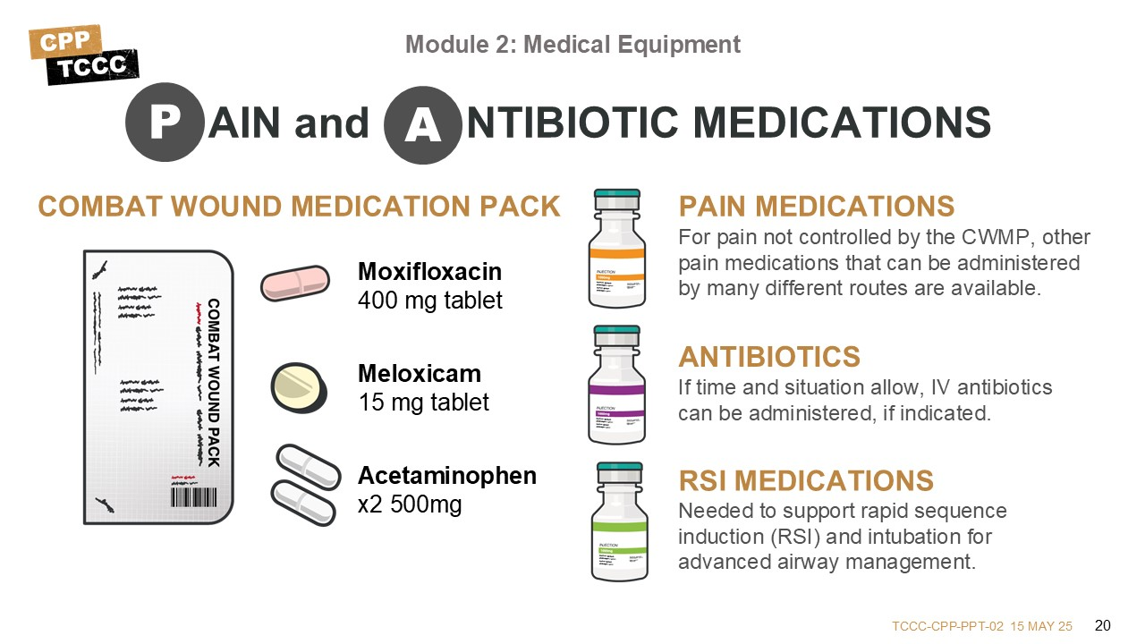The Combat Wound Medication Pack, or CWMP, is a prepackaged medication packet with drugs and dosages specifically chosen for use in combat casualty care and contains drugs for mild to moderate pain (meloxicam and acetaminophen) and an antibiotic specific for penetrating wounds (moxifloxacin). The CMC kits bring additional medications that support the management of pain that isn’t controlled by the CWMP and IV antibiotics that are used if the time and situation allow.
