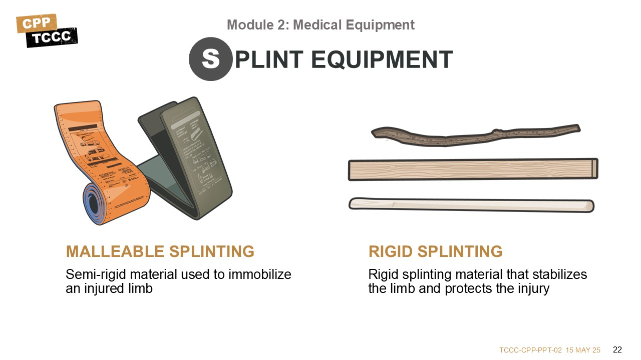 Broken bones are a common injury, and both CLS, CMC, and CPP kits usually have equipment to splint those fractures. Malleable splints can be shaped to fit the needs of various fractures; however, they must be adequately bent to function properly. Cravats can be used to secure a splint or to create a sling or a swath. Femur fractures, or long bone fractures, can sometimes compromise the lower leg unless traction is applied during the splinting process, and some kits will come with traction splints to support that requirement.
