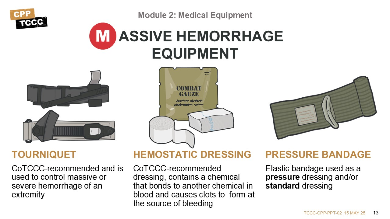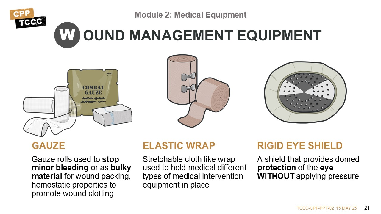 Throughout this course, you will be learning about the details of most of this equipment. Identifying which items have CoTCCC-recommended options, specific information about the actual materials, and describing how they are used is part of each course module. But an introduction to key equipment items might help set the stage.