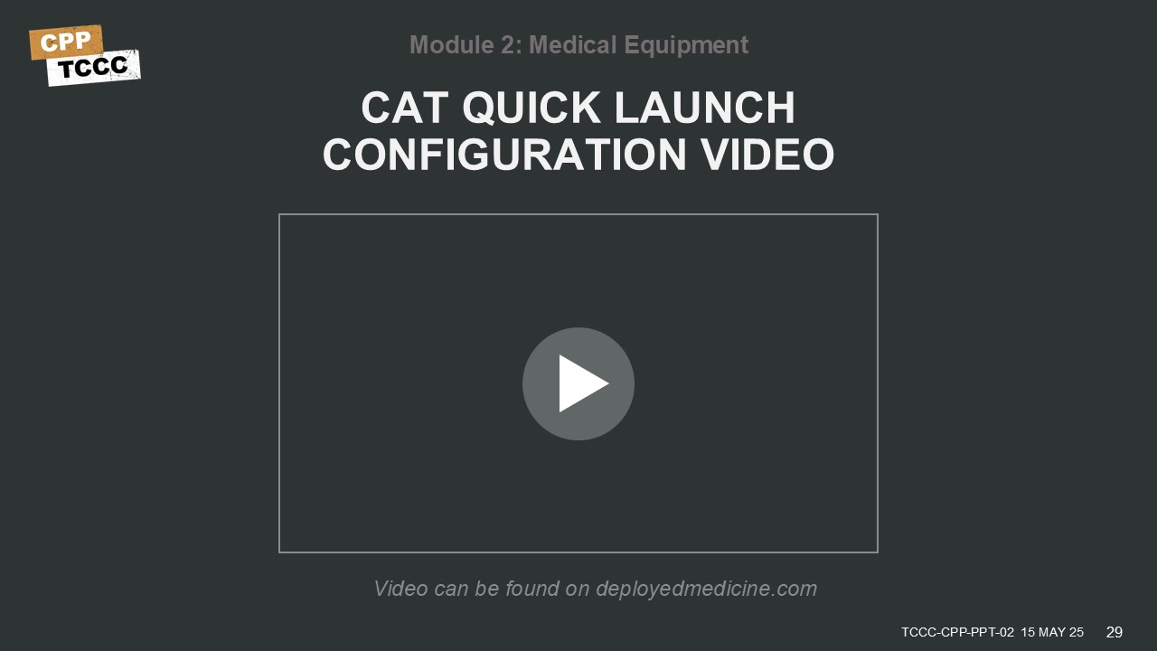 For some items that don't require sterility or won't degrade with exposure to air, like tourniquets, it is appropriate to take them out of their packaging to save time when using them on the battlefield. With the CAT tourniquet, one of the more common limb tourniquets in the inventory, there are configuration options to optimize its one-handed use when supplying or resupplying your equipment kits. This video will review the steps you would take to configure a CAT tourniquet.