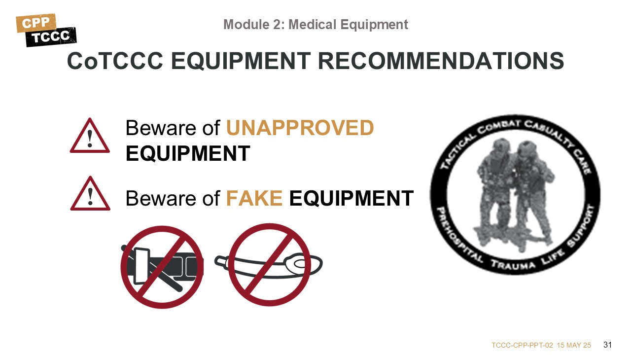 CoTCCC recommendations are based on scientific studies, evidence-based medicine, subject matter expert consensus, field-use testing, and/or lessons learned from the battlefield. Always check to ensure your kits are stocked with CoTCCC-recommended items and beware of unapproved equipment.