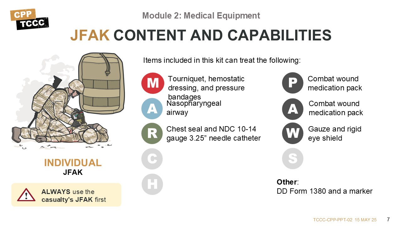 Every piece of equipment chosen for the JFAK is evidence-based (based on lessons from years of war in Iraq and Afghanistan) and serves a distinct purpose for the individual Service member; knowing how to properly use what is in the JFAK can save a life.