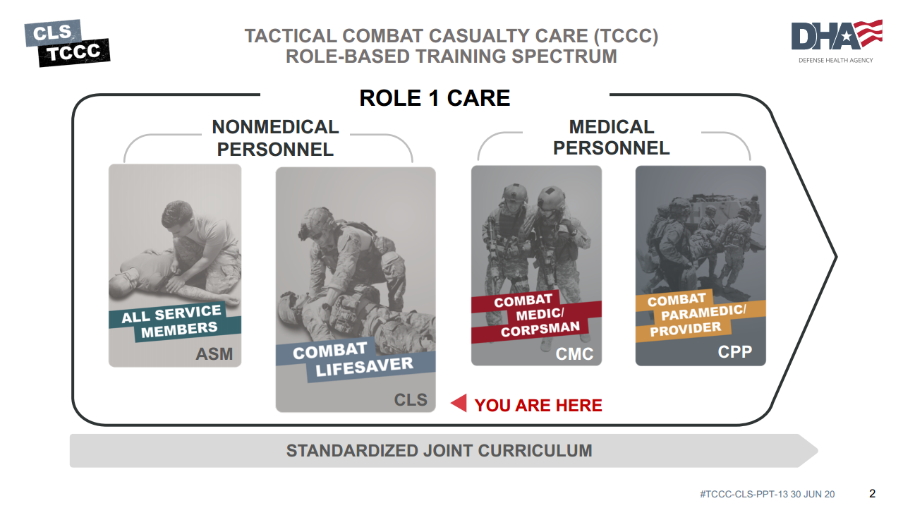 Tactical Combat Casualty Care is broken up into four roles of care. The most basic is taught to All Service Members (ASM), which is designed to instruct in the absolute basics of hemorrhage control and to recognize more serious injuries.