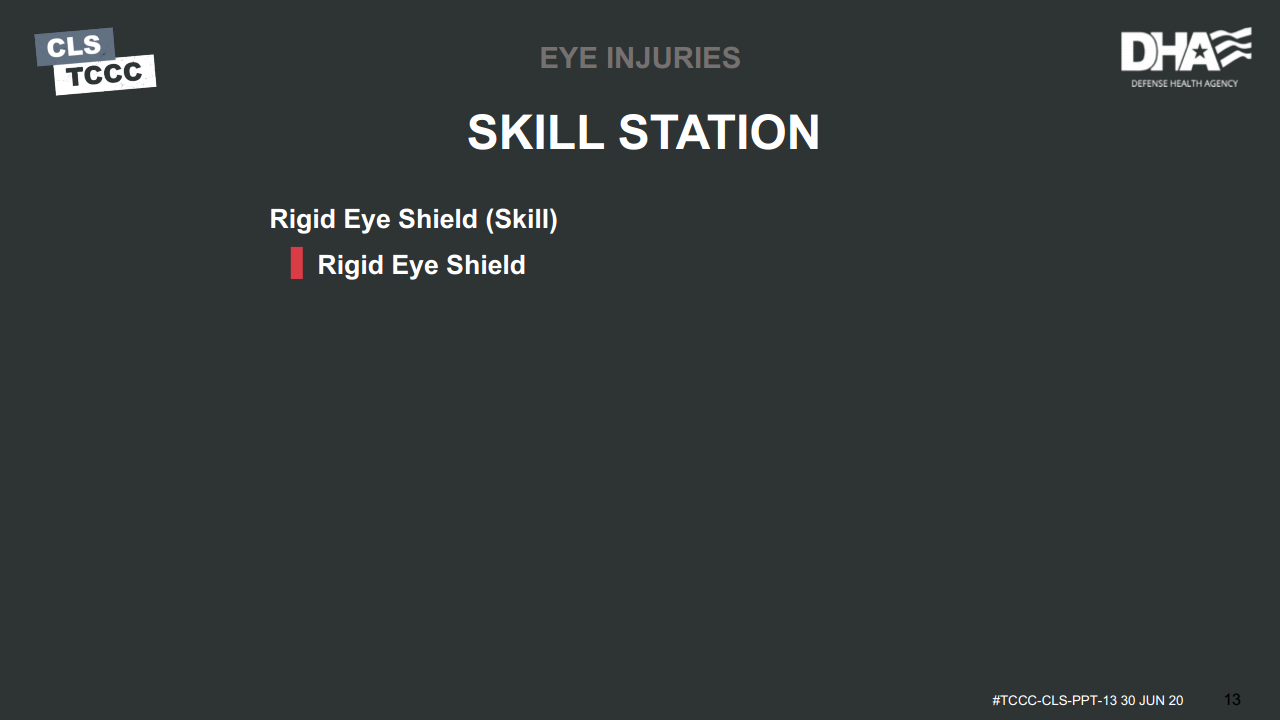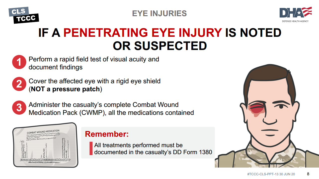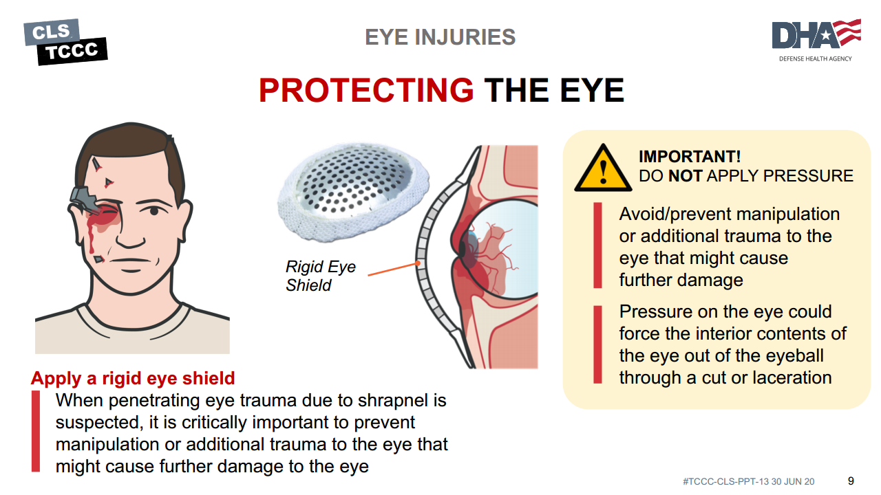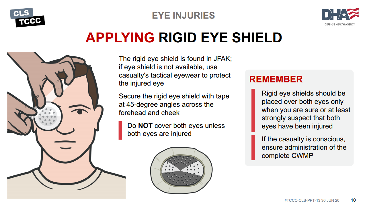 If no rigid eye shield is available, tactical eyewear may be used to protect the eyes from further trauma.