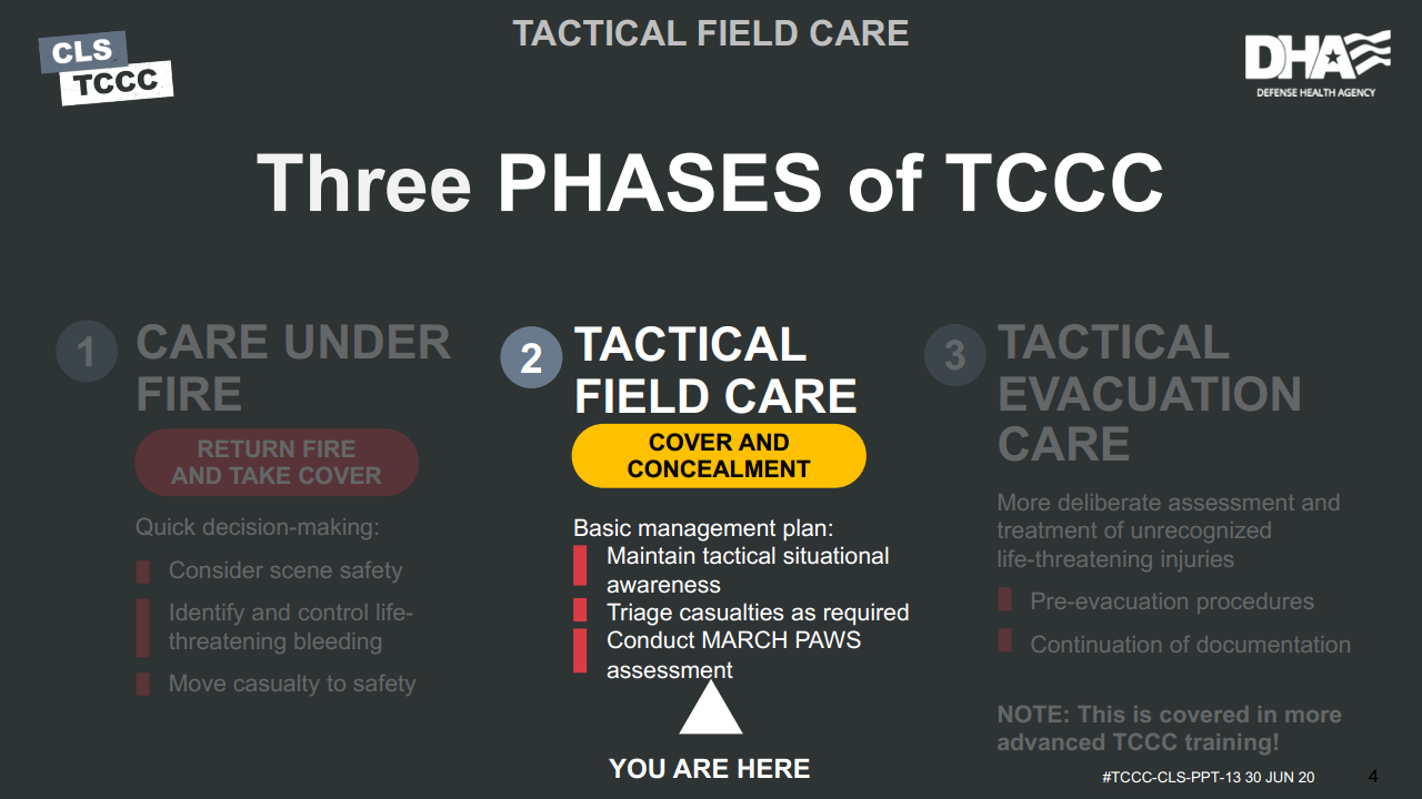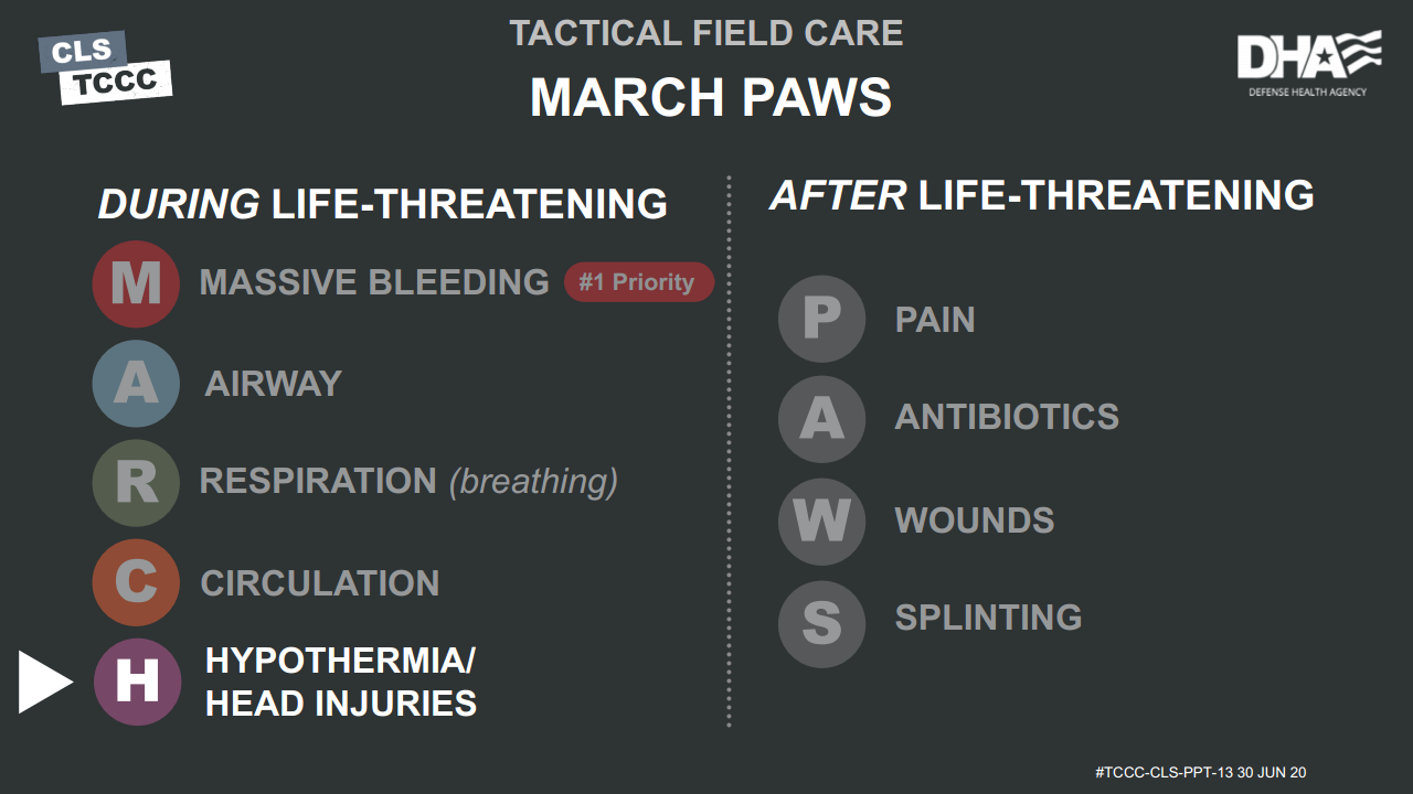Remember, you are now in the Tactical Field Care phase of care, and so the focus has shifted from immediate lifethreatening hemorrhage control while still under enemy fire in the Care Under Fire phase, to the reassessment of all previous interventions, followed by the prevention and treatment of other injuries and complications such as head and eye injuries.