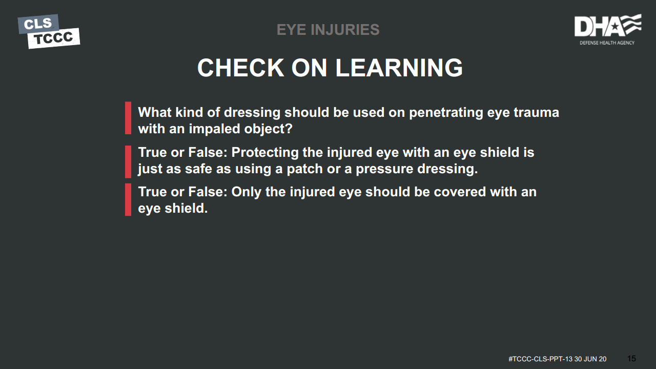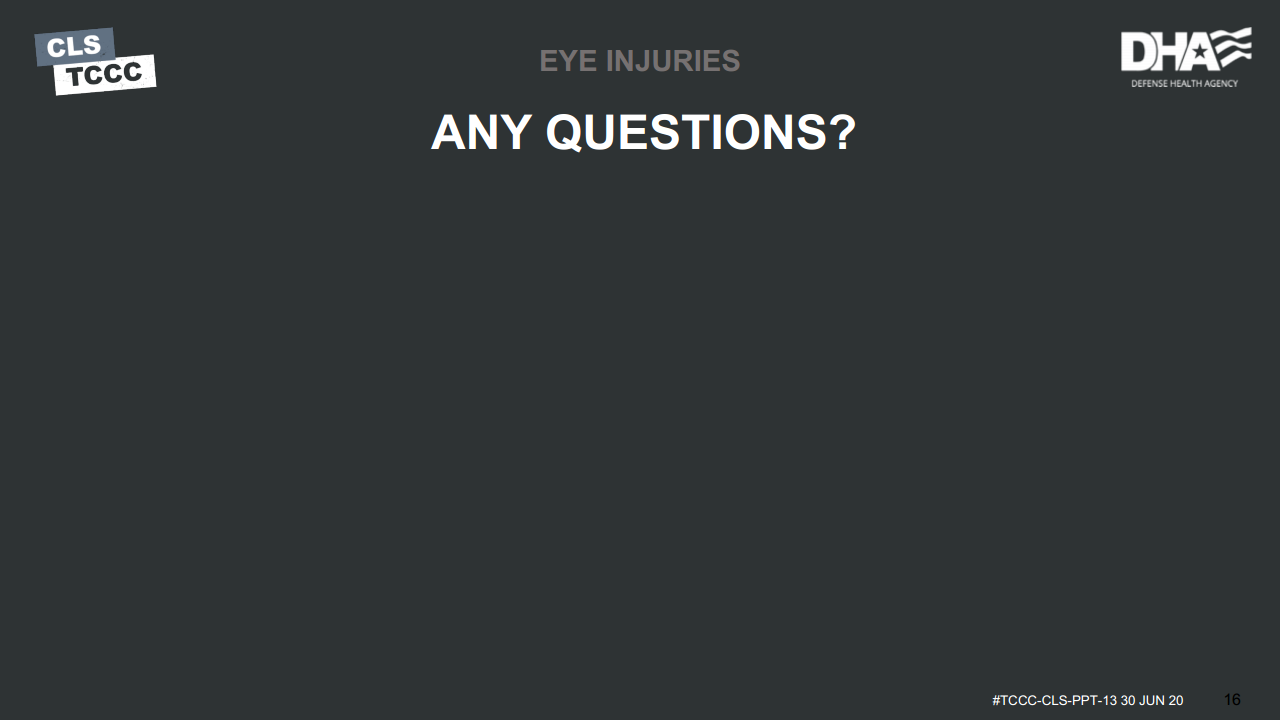 In this module, we discussed basic care of an eye injury. We addressed how to recognize an eye injury, steps to treat it, application of a rigid eye shield to a trauma casualty, and proper documentation.