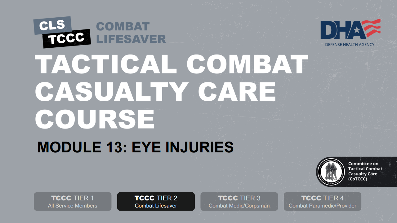 Remember, you are now in the Tactical Field Care phase of care, and so the focus has shifted from immediate lifethreatening hemorrhage control while still under enemy fire in the Care Under Fire phase, to the reassessment of all previous interventions, followed by the prevention and treatment of other injuries and complications such as eye injuries.
