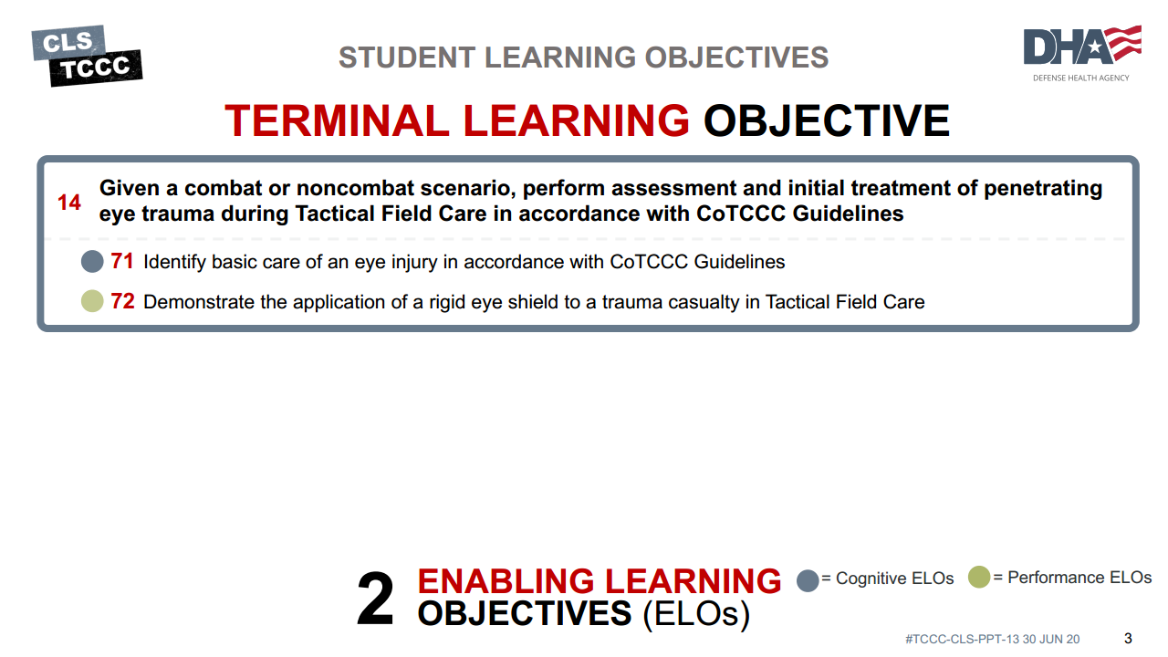 The cognitive learning objective is to identify the basic care of an eye injury, and the performance learning objective is to demonstrate the application of a rigid eye shield to a trauma casualty.