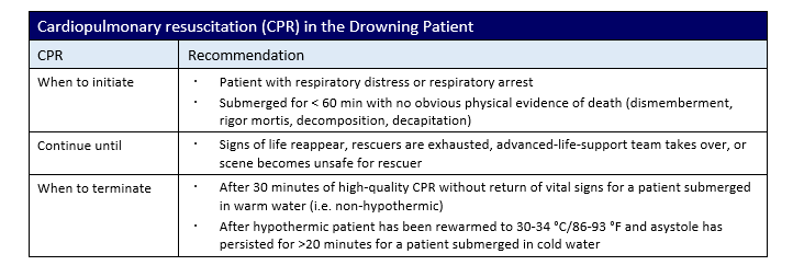 Patients requiring continued resuscitation or those with concern for hypothermia may require more advanced prehospital care which cannot be delivered by typical bystanders such as definitive airway management, supplemental oxygen or mechanical ventilatory support, gastric decompression, or thermal insulation.11,15 Aggressive resuscitation attempts should be initiated unless clear signs of death or as limited by operational requirements. Patients have survived prolonged submersion historically, especially in the hypothermic environment.13 For this level of care, use the typical ABCDE format below.