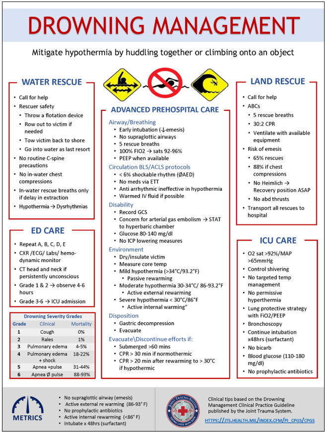 Upon arrival to the Emergency Room (ER), rapidly evaluate the patient and rule out traumatic injury. Perform primary (ABCDE) and secondary assessment with specific focus on the following: secure airway, provide adequate oxygenation, ensure hemodynamic stability, gastric decompression, thermal insulation, and identifying concomitant traumatic injury. 10,11,19,22 Following initial ER resuscitation, specific systems-based interventions may be applied as noted in the ICU Management section. Additional immediate interventions below (does not substitute for ER standards of care):
