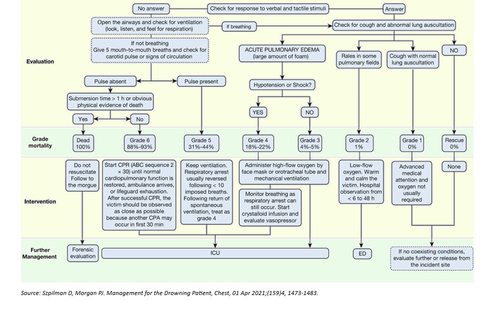 Once the patient is stabilized from a respiratory and hemodynamic standpoint, disposition should be determined. Figure 1 below helps to establish guidelines for ICU admission versus observation and safe discharge based drowning mortality risk and drowning grade (Table 3).