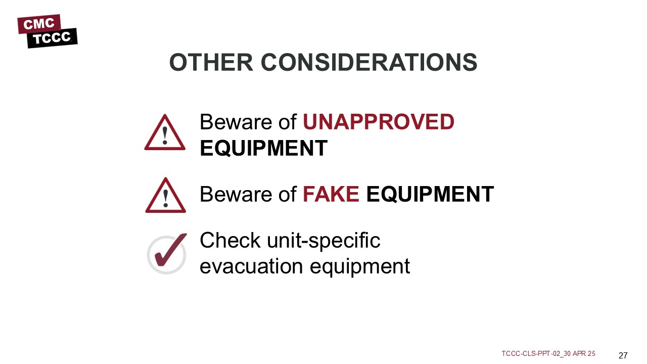 Make sure all required and applicable equipment is in your Service-specific JFAKs, CLS Bags, and CMC Bag.