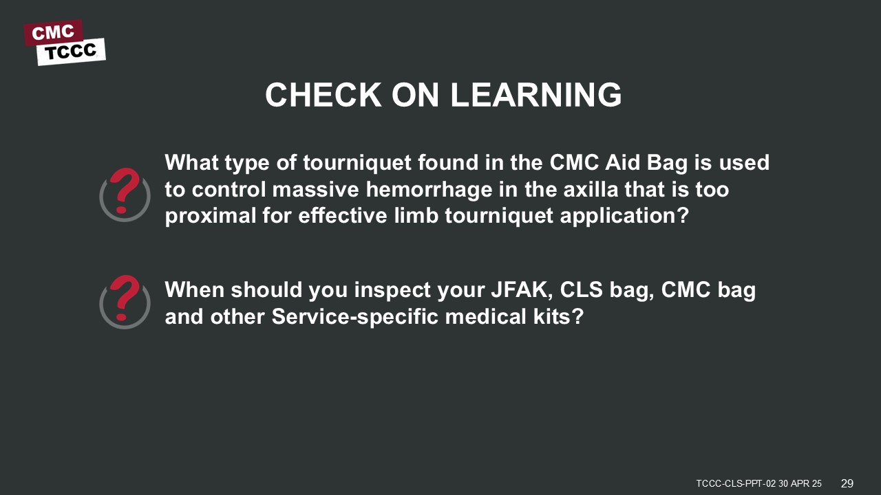 Pre-combat inspections (PCIs) or readiness checks are critical for every piece of equipment a service member carries and/or uses. For the JFAK, CLS bag, CMC aid bag, or unit/service-specific first aid kit, your life or your buddy’s life may depend on the readiness and serviceability of the contents. It is critical that you frequently inspect equipment before, during, and after all training events and combat missions. Resupply when needed.