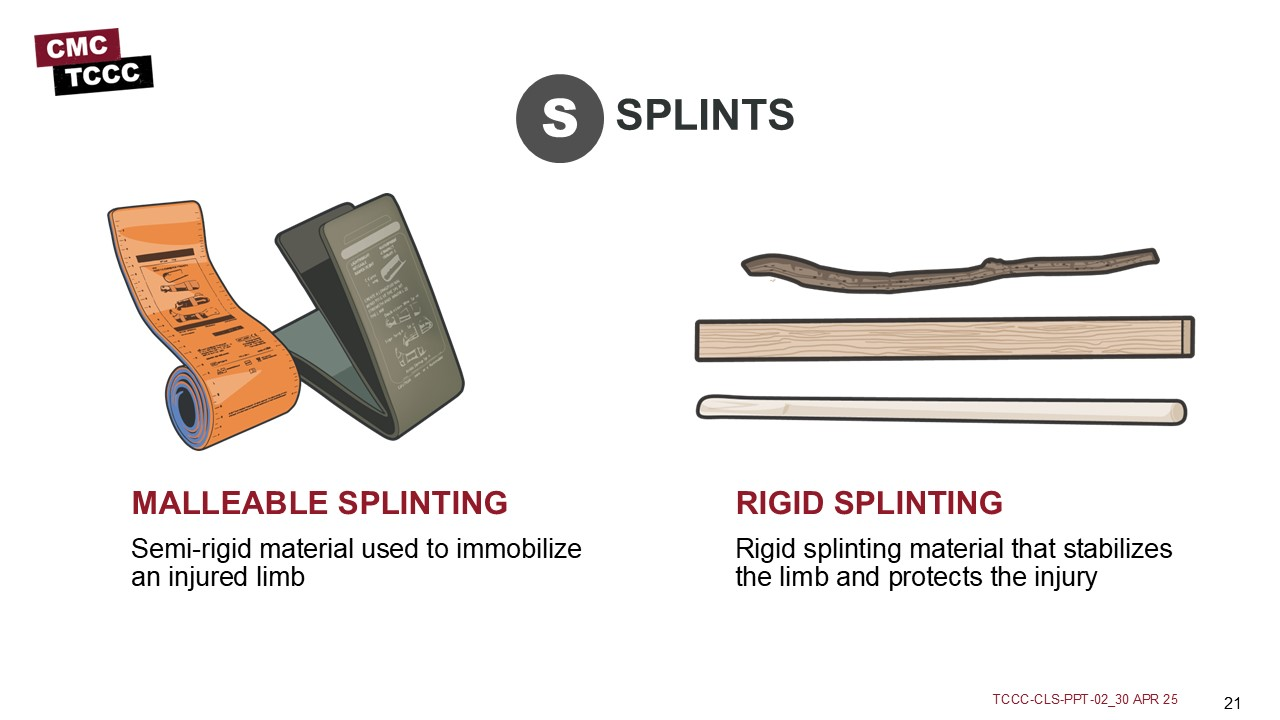 Broken bones are a common injury, and both CLS kits and CMC kits usually have equipment to splint those fractures. Malleable splints can be shaped to fit the needs of various fractures; however, they must be adequately bent to function properly. Cravats can be used to secure a splint or to create a sling or a swath. Femur fractures, or long bone fractures, can sometimes compromise the lower leg unless traction is applied during the splinting process, and some kits will come with traction splints to support that requirement.